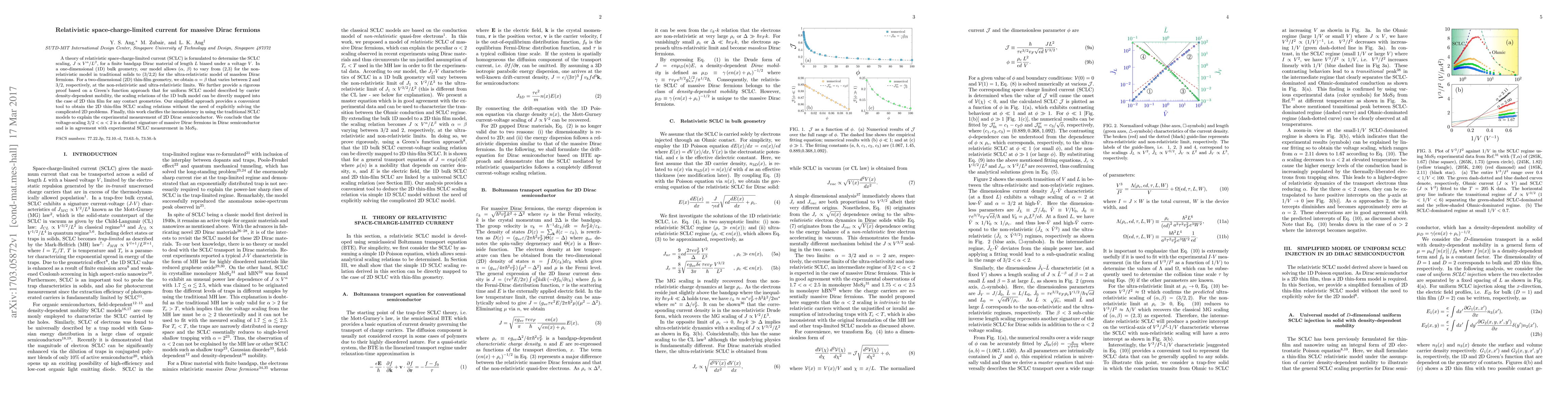 A theory of relativistic space-charge-limited current (SCLC) is formulated to determine the SCLC scaling, $J\propto V^{\alpha}/L^{\beta}$, for a finite bandgap Dirac material of length $L$ biased under a voltage $V$. In a one-dimensional (1D) bulk geometry, our model allows ($\alpha$, $\beta$) to vary from (2,3) for the non-relativistic model in traditional solids to (3/2,2) for the ultra-relativistic model of massless Dirac fermions. For a two-dimensional (2D) thin-film geometry, we obtain $\alpha = \beta$ that varies between 2 and 3/2, respectively, at the non-relativistic and ultra-relativistic limits. We further provide a rigorous proof based on a Green's function approach that for uniform SCLC model described by carrier density-dependent mobility, the scaling relations of the 1D bulk model can be directly mapped into the case of 2D thin film for any contact geometries. Our simplified approach provides a convenient tool to obtain the 2D thin-film SCLC scaling relations without the need of explicitly solving the complicated 2D problems. Finally, this work clarifies the inconsistency in using the traditional SCLC models to explain the experimental measurement of 2D Dirac semiconductor. We conclude that the voltage-scaling $3/2 < \alpha < 2$ is a distinct signature of massive Dirac fermions in Dirac semiconductor and is in agreement with experimental SCLC measurement in MoS$_2$.