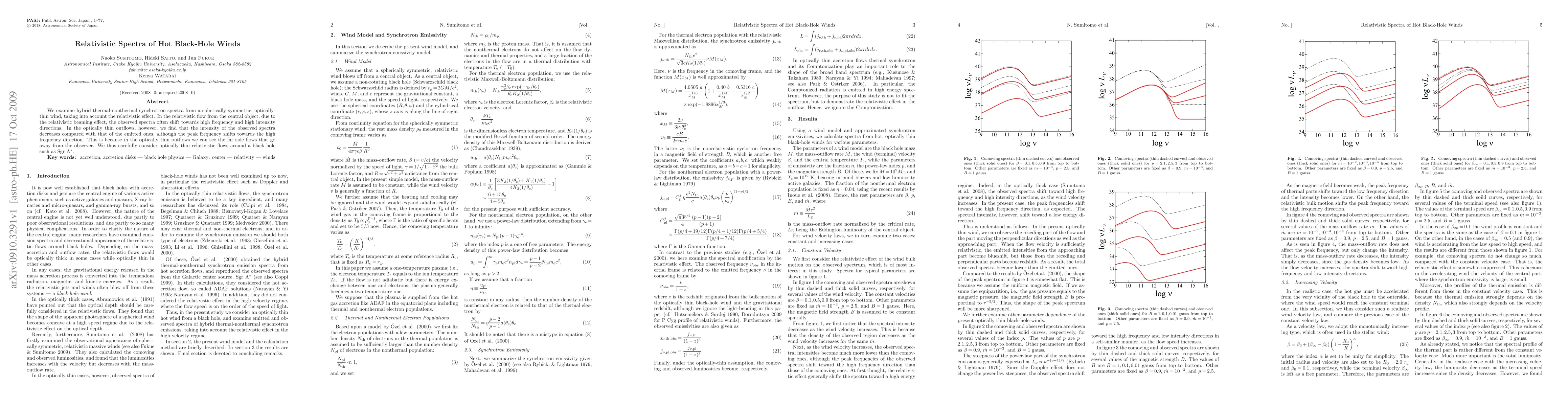 We examine hybrid thermal-nonthermal synchrotron spectra from a spherically symmetric, optically-thin wind, taking into account the relativistic effect. In the relativistic flow from the central object, due to the relativistic beaming effect, the observed spectra often shift towards high frequency and high intensity directions. In the optically thin outflows, however, we find that the intensity of the observed spectra decreases compared with that of the emitted ones, although the peak frequency shifts towards the high frequency direction. This is because in the optically thin outflows we can see the far side flows that go away from the observer. We thus carefully consider optically thin relativistic flows around a black hole such as Sgr A$^*$.