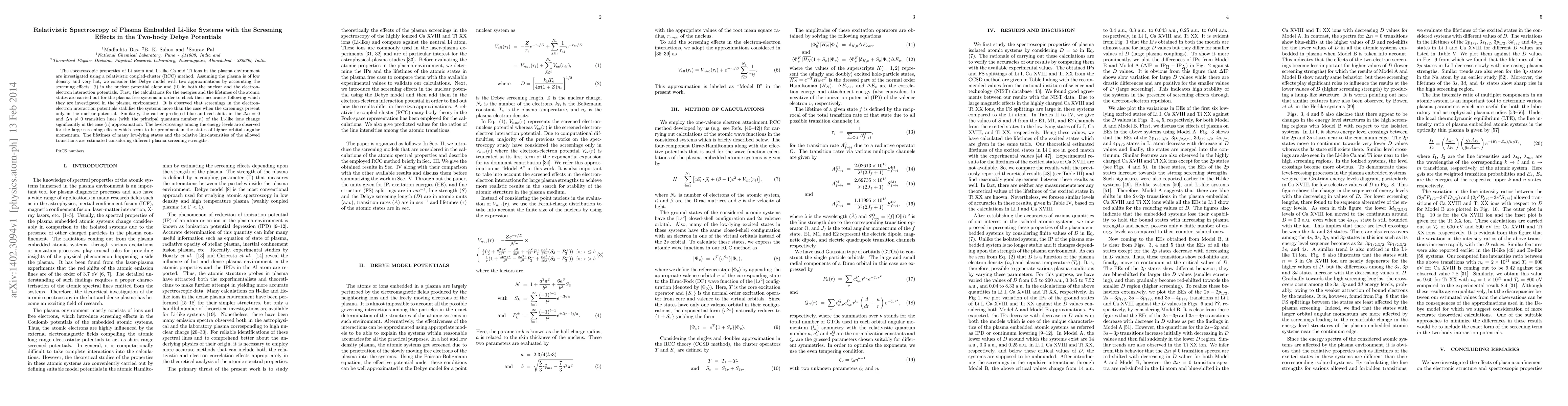 The spectroscopic properties of Li atom and Li-like Ca and Ti ions in the plasma environment are investigated using a relativistic coupled-cluster (RCC) method. Assuming the plasma is of low density and very hot, we consider the Debye model with two approximations by accounting the screening effects: (i) in the nuclear potential alone and (ii) in both the nuclear and the electron-electron interaction potentials. First, the calculations for the energies and the lifetimes of the atomic states are carried out for the plasma free systems in order to check their accuracies following which they are investigated in the plasma environment. It is observed that screenings in the electron-electron interaction potentials stabilize the systems more than the case when the screenings present only in the nuclear potential. Similarly, the earlier predicted blue and red shifts in the $\Delta n=0$ and $\Delta n \ne 0$ transition lines (with the principal quantum number $n$) of the Li-like ions change significantly in the case (ii) approximation. The level-crossings among the energy levels are observed for the large screening effects which seem to be prominent in the states of higher orbital angular momentum. The lifetimes of many low-lying states and the relative line-intensities of the allowed transitions are estimated considering different plasma screening strengths.