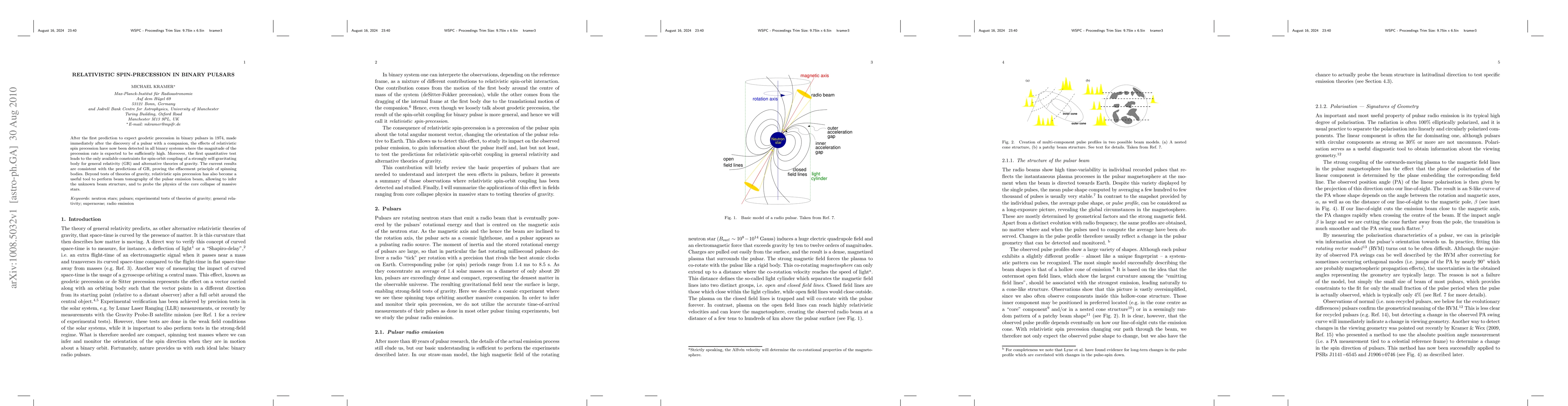 This paper confirms the detection of relativistic spin precession in binary pulsars, consistent with general relativity predictions, and uses this phenomenon to study spin-orbit coupling and the core structure of massive stars. It also aids in understanding the pulsar emission beam through beam tomography.