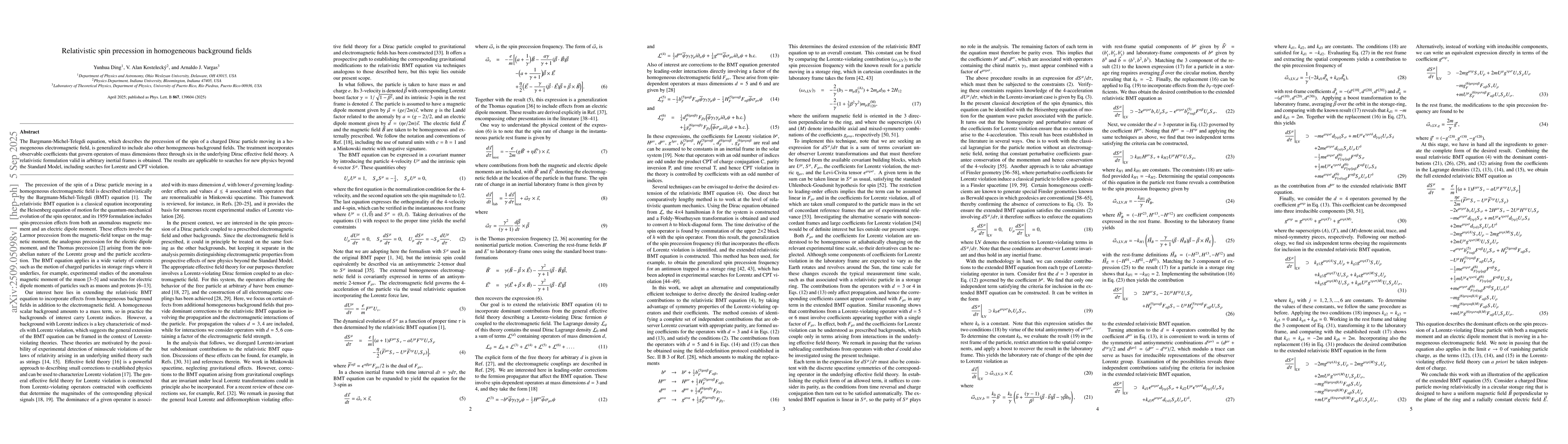 The Bargmann-Michel-Telegdi equation, which describes the precession of the spin of a charged Dirac particle moving in a homogeneous electromagnetic field, is generalized to include also other homogeneous background fields. The treatment incorporates observable coefficients that govern operators of mass dimensions three through six in the underlying Dirac effective field theory. A relativistic formulation valid in arbitrary inertial frames is obtained. The results are applicable to searches for new physics beyond the Standard Model, including searches for Lorentz and CPT violation.