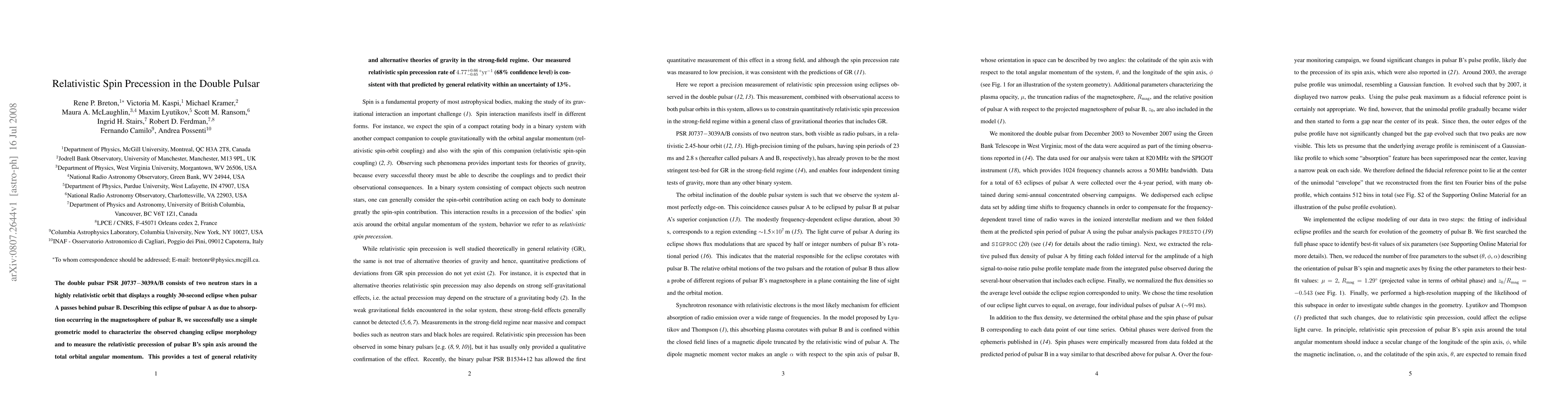 The double pulsar PSR J0737-3039A/B offers a unique system to study relativistic spin precession and strong-field gravity. By analyzing eclipse morphology, researchers measured a spin precession rate consistent with general relativity predictions.