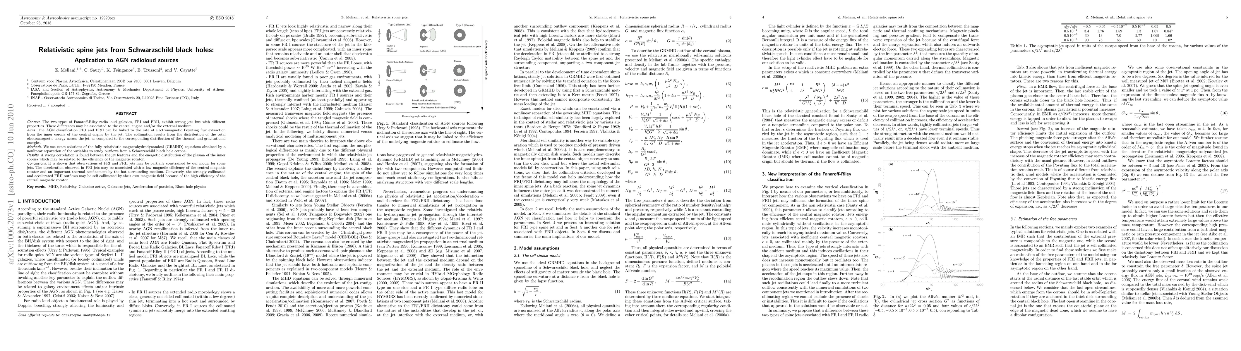 The two types of Fanaroff-Riley radio loud galaxies, FRI and FRII, exhibit strong jets but with different properties. These differences may be associated to the central engine and/or the external medium. Aims: The AGN classification FRI and FRII can be linked to the rate of electromagnetic Poynting flux extraction from the inner corona of the central engine by the jet. The collimation results from the distribution of the total electromagnetic energy across the jet, as compared to the corresponding distribution of the thermal and gravitational energies. We use exact solutions of the fully relativistic magnetohydrodynamical (GRMHD) equations obtained by a nonlinear separation of the variables to study outflows from a Schwarzschild black hole corona. A strong correlation is found between the jet features and the energetic distribution of the plasma of the inner corona which may be related to the efficiency of the magnetic rotator. It is shown that observations of FRI and FRII jets may be partially constrained by our model for spine jets. The deceleration observed in FRI jets may be associated with a low magnetic efficiency of the central magnetic rotator and an important thermal confinement by the hot surrounding medium. Conversely, the strongly collimated and accelerated FRII outflows may be self collimated by their own magnetic field because of the high efficiency of the central magnetic rotator.