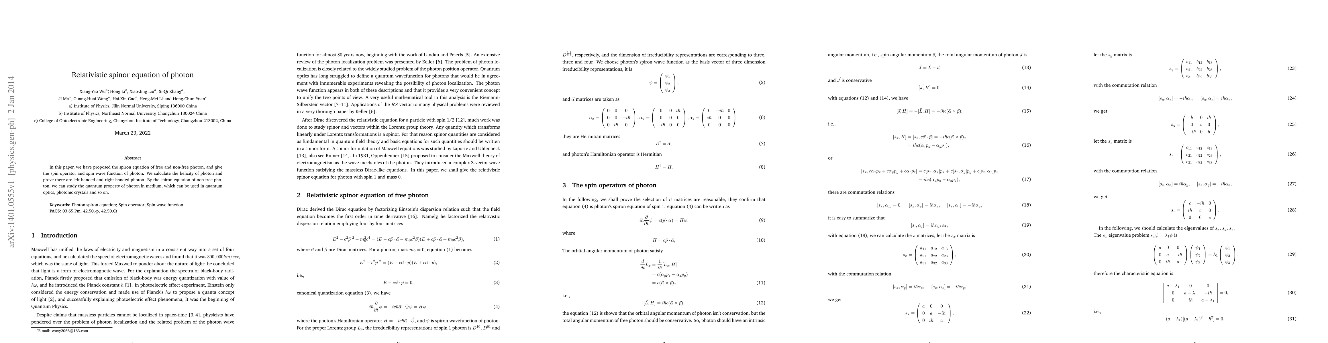 In this paper, we have proposed the spiron equation of free and non-free photon, and give the spin operator and spin wave function of photon. We calculate the helicity of photon and prove there are left-handed and right-handed photon. By the spiron equation of non-free photon, we can study the quantum property of photon in medium, which can be used in quantum optics, photonic crystals and so on.