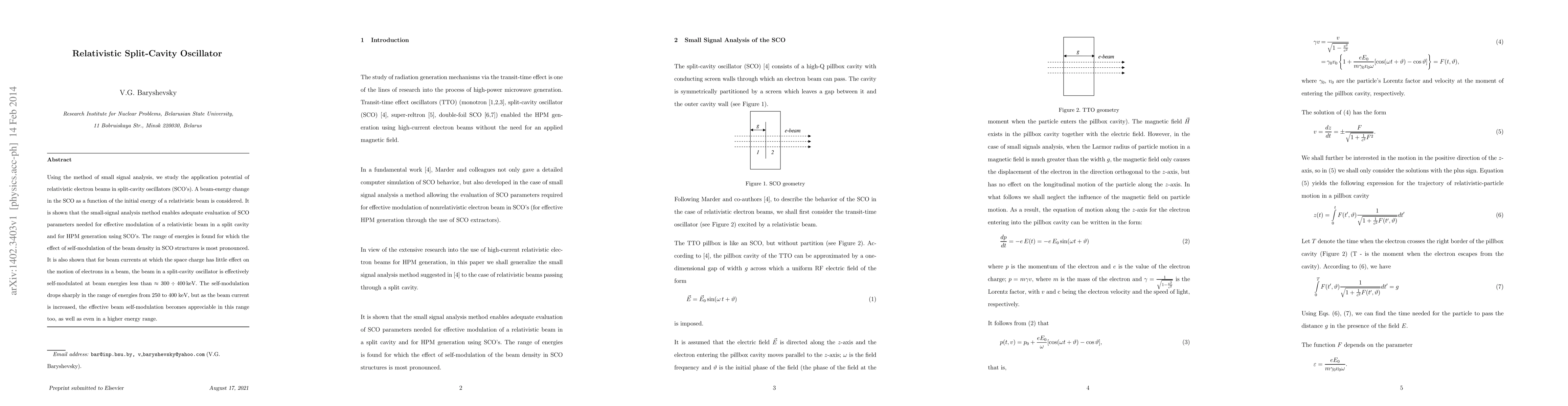 This paper investigates the use of relativistic electron beams in split-cavity oscillators (SCO's) via small-signal analysis, demonstrating effective modulation and high-power microwave (HPM) generation. It identifies energy ranges where beam density self-modulation is most effective, particularly at beam energies below 400 keV, with increased beam current enhancing modulation at higher energies.