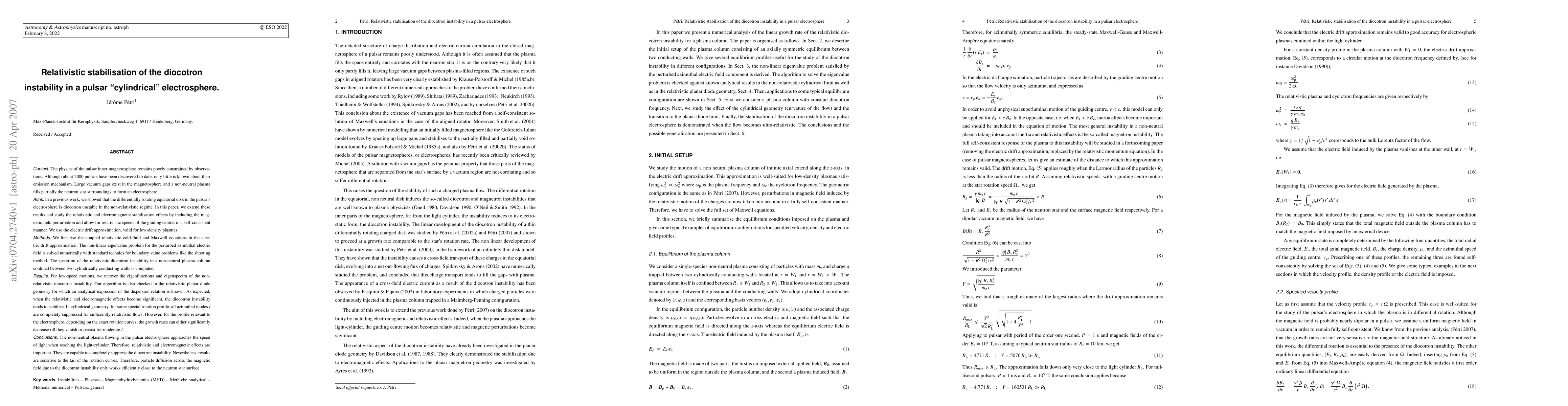 This study extends previous research on diocotron instability in pulsar electrospheres, incorporating relativistic effects and magnetic field perturbations. Using numerical methods, it finds that while relativistic and electromagnetic effects generally stabilize the instability, certain rotation profiles in cylindrical geometry can either suppress or allow for moderate growth rates, depending on the specific rotation curves.