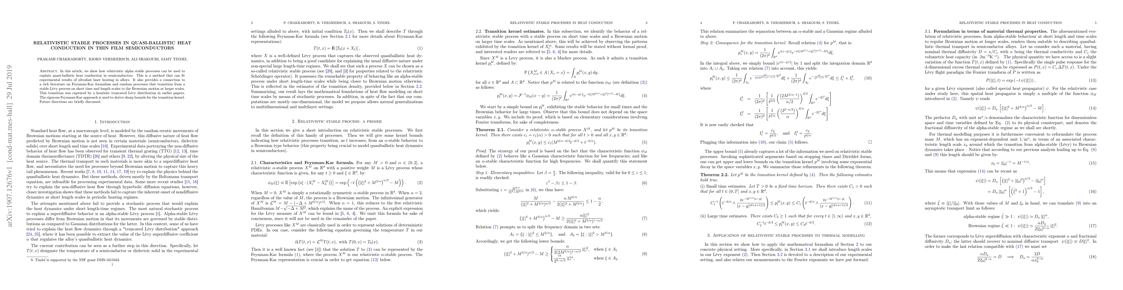 This paper demonstrates the application of relativistic alpha stable processes to explain quasi-ballistic heat conduction in thin film semiconductors, fitting experimental ultrafast laser heating results. It employs the Feynman-Kac formalism to derive rigorous bounds for the transition from stable L\'evy processes to Brownian motion.