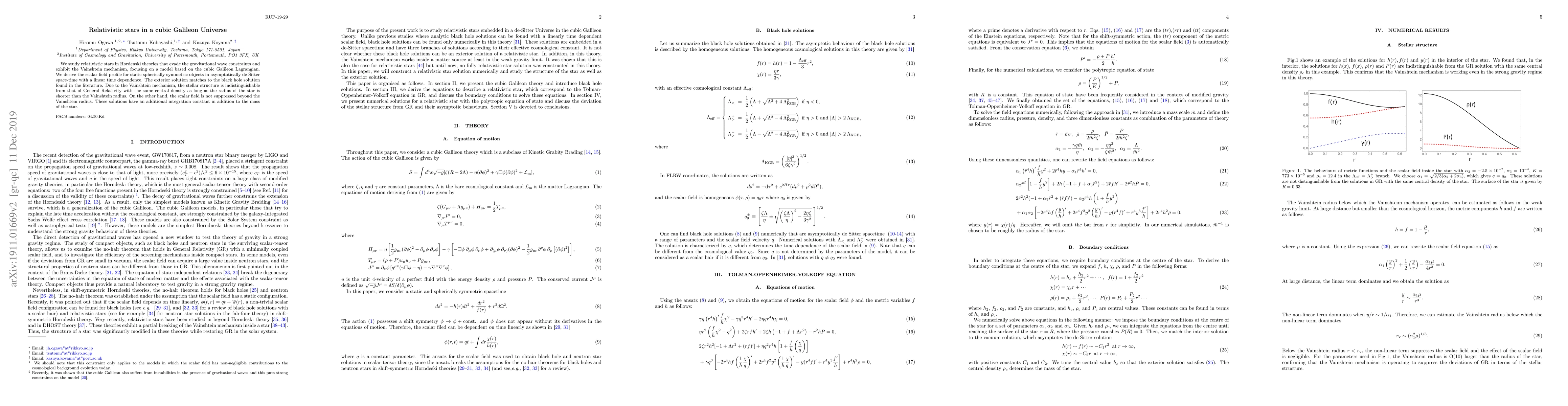 We study relativistic stars in Hordenski theories that evade the gravitational wave constraints and exhibit the Vainshtein mechanism, focusing on a model based on the cubic Galileon Lagrangian. We derive the scalar field profile for static spherically symmetric objects in asymptotically de Sitter space-time with a linear time dependence. The exterior solution matches to the black hole solution found in the literature. Due to the Vainshtein mechanism, the stellar structure is indistinguishable from that of General Relativity with the same central density as long as the radius of the star is shorter than the Vainshtein radius. On the other hand, the scalar field is not suppressed beyond the Vainshtein radius. These solutions have an additional integration constant in addition to the mass of the star.