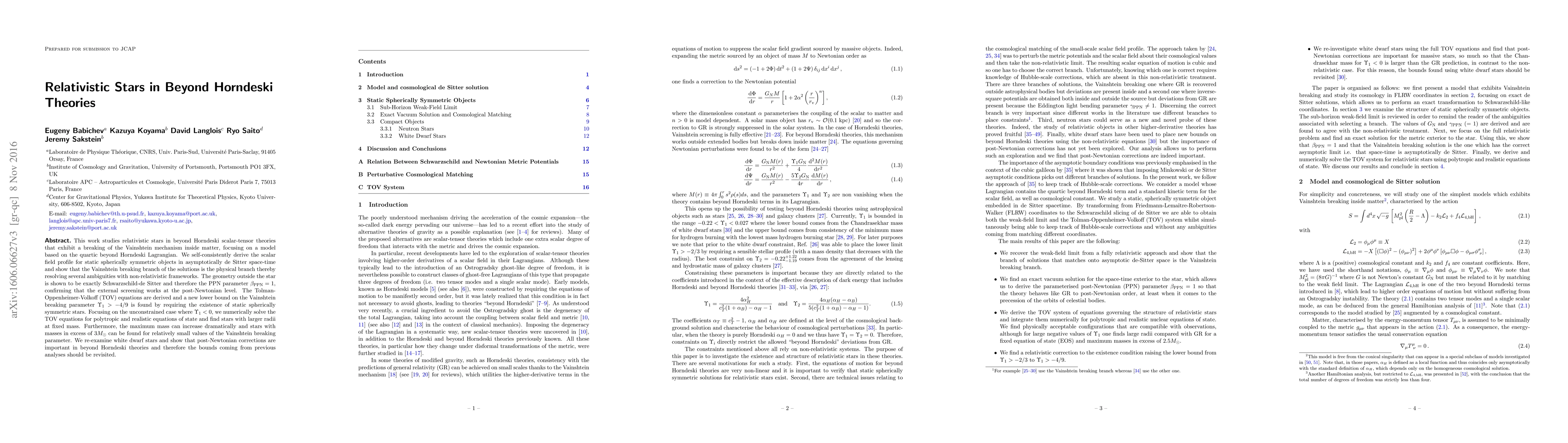This work studies relativistic stars in beyond Horndeski scalar-tensor theories that exhibit a breaking of the Vainshtein mechanism inside matter, focusing on a model based on the quartic beyond Horndeski Lagrangian. We self-consistently derive the scalar field profile for static spherically symmetric objects in asymptotically de Sitter space-time and show that the Vainshtein breaking branch of the solutions is the physical branch thereby resolving several ambiguities with non-relativistic frameworks. The geometry outside the star is shown to be exactly Schwarzschild-de Sitter and therefore the PPN parameter $\beta_{\rm PPN}=1$, confirming that the external screening works at the post-Newtonian level. The Tolman-Oppenheimer-Volkoff (TOV) equations are derived and a new lower bound on the Vainshtein breaking parameter $\Upsilon_1>-4/9$ is found by requiring the existence of static spherically symmetric stars. Focusing on the unconstrained case where $\Upsilon_1<0$, we numerically solve the TOV equations for polytropic and realistic equations of state and find stars with larger radii at fixed mass. Furthermore, the maximum mass can increase dramatically and stars with masses in excess of $3M_\odot$ can be found for relatively small values of the Vainshtein breaking parameter. We re-examine white dwarf stars and show that post-Newtonian corrections are important in beyond Horndeski theories and therefore the bounds coming from previous analyses should be revisited.