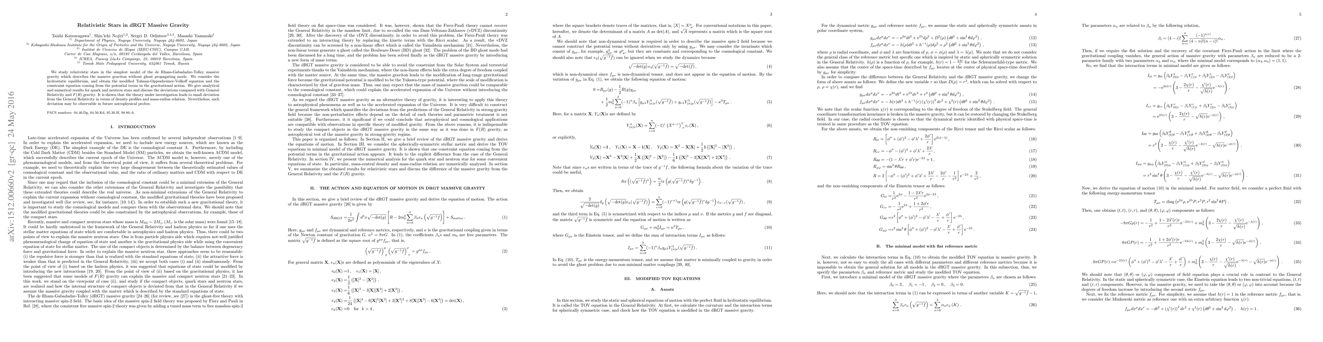 This paper investigates relativistic stars within the framework of dRGT massive gravity, deriving modified equations of hydrostatic equilibrium and exploring deviations from General Relativity. Analytical and numerical results for quark and neutron stars show small deviations in density profiles and mass-radius relations, potentially detectable in future astrophysical observations.