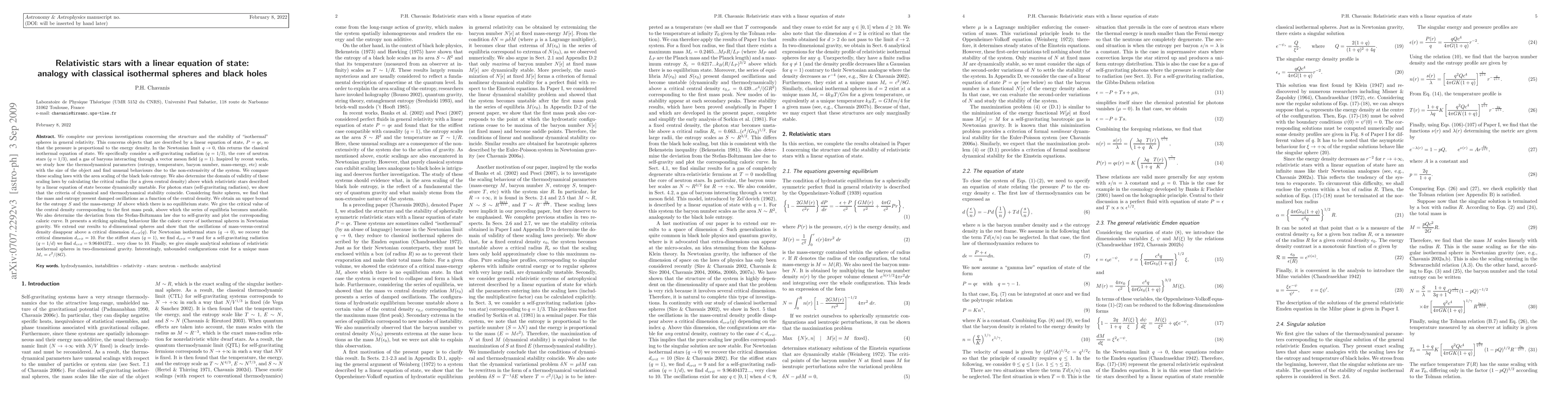 We complete our previous investigation concerning the structure and the stability of "isothermal" spheres in general relativity. This concerns objects that are described by a linear equation of state $P=q\epsilon$ so that the pressure is proportional to the energy density. In the Newtonian limit $q\to 0$, this returns the classical isothermal equation of state. We consider specifically a self-gravitating radiation (q=1/3), the core of neutron stars (q=1/3) and a gas of baryons interacting through a vector meson field (q=1). We study how the thermodynamical parameters scale with the size of the object and find unusual behaviours due to the non-extensivity of the system. We compare these scaling laws with the area scaling of the black hole entropy. We also determine the domain of validity of these scaling laws by calculating the critical radius above which relativistic stars described by a linear equation of state become dynamically unstable. For photon stars, we show that the criteria of dynamical and thermodynamical stability coincide. Considering finite spheres, we find that the mass and entropy as a function of the central density present damped oscillations. We give the critical value of the central density, corresponding to the first mass peak, above which the series of equilibria becomes unstable. Finally, we extend our results to d-dimensional spheres. We show that the oscillations of mass versus central density disappear above a critical dimension d_{crit}(q). For Newtonian isothermal stars (q=0) we recover the critical dimension d_{crit}=10. For the stiffest stars (q=1) we find d_{crit}=9 and for a self-gravitating radiation (q=1/d) we find d_{crit}=9.96404372... very close to 10. Finally, we give analytical solutions of relativistic isothermal spheres in 2D gravity.