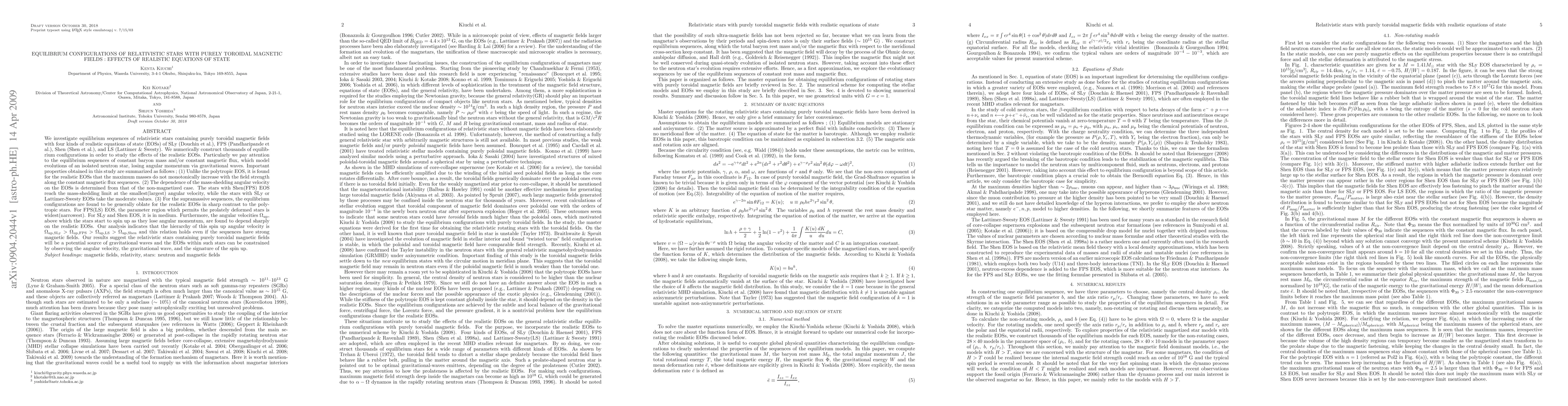 This study investigates the equilibrium sequences of relativistic stars with toroidal magnetic fields, employing four realistic equations of state (EOSs). The research finds that the mass-shedding angular velocity and spin-up behavior of these stars depend significantly on the EOS, with the Shen EOS allowing the smallest angular velocity for mass shedding and the FPS EOS permitting the widest region for prolate deformations.