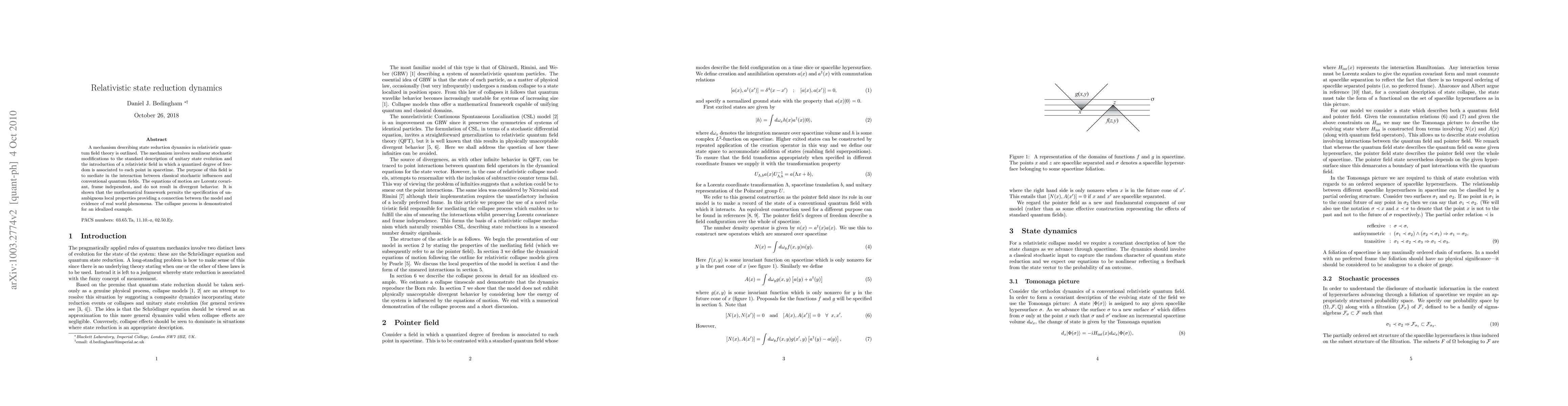 A mechanism describing state reduction dynamics in relativistic quantum field theory is outlined. The mechanism involves nonlinear stochastic modifications to the standard description of unitary state evolution and the introduction of a relativistic field in which a quantized degree of freedom is associated to each point in spacetime. The purpose of this field is to mediate in the interaction between classical stochastic influences and conventional quantum fields. The equations of motion are Lorentz covariant, frame independent, and do not result in divergent behavior. It is shown that the mathematical framework permits the specification of unambiguous local properties providing a connection between the model and evidence of real world phenomena. The collapse process is demonstrated for an idealized example.