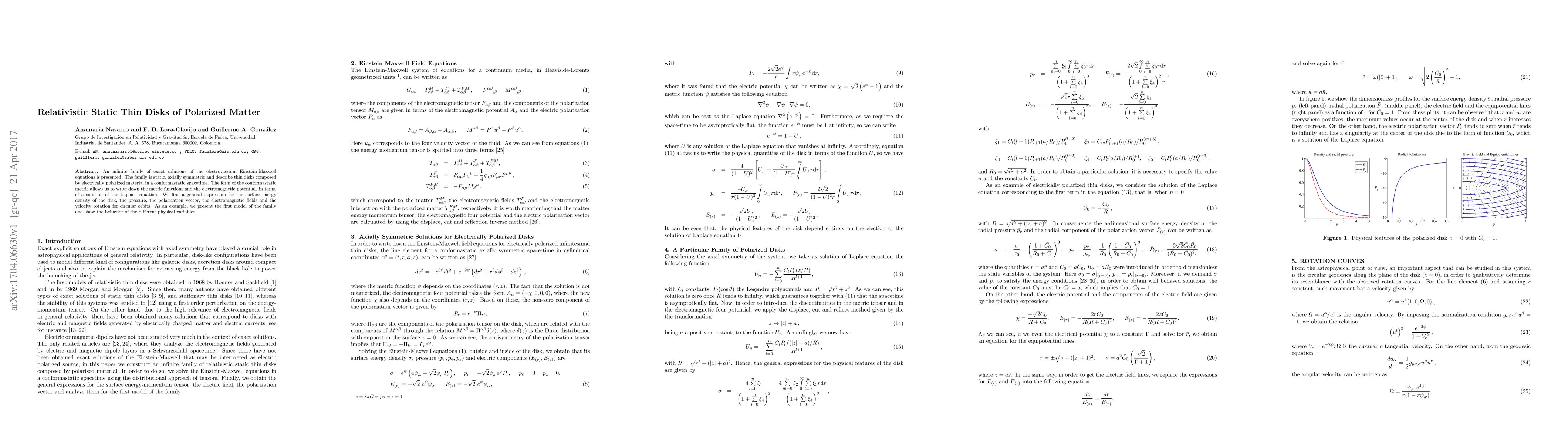 This paper presents exact solutions for relativistic static thin disks of polarized matter in electrovacuum, describing their metric functions, electromagnetic fields, and energy-momentum distribution. It exemplifies the first model of this infinite family and analyzes physical variables such as surface energy density and rotation velocity.