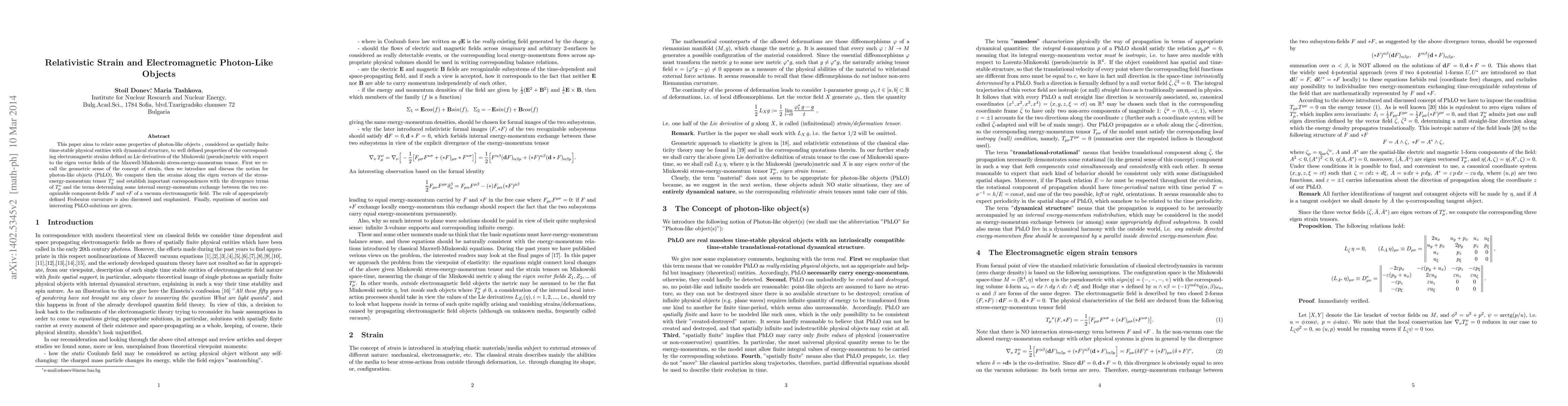 This paper aims to relate some properties of photon-like objects, considered as spatially finite time-stable physical entities with dynamical structure, to well defined properties of the corresponding electromagnetic strains defined as Lie derivatives of the Minkowski (pseudo)metric with respect to the eigen vector fields of the Maxwell-Minkowski stress-energy-momentum tensor. First we recall the geometric sense of the concept of strain, then we introduce and discuss the notion for photon-like objects (PhLO). We compute then the strains along the eigen vectors of the stress-energy-momentum tensor $T_{\mu}^{\nu}$ and establish important correspondences with the divergence terms of $T_{\mu}^{\nu}$ and the terms determining some internal energy-momentum exchange between the two recognizable component-fields $F$ and $*F$ of a vacuum electromagnetic field. The role of appropriately defined Frobenius curvature is also discussed and emphasized. Finally, equations of motion and interesting PhLO-solutions are given.