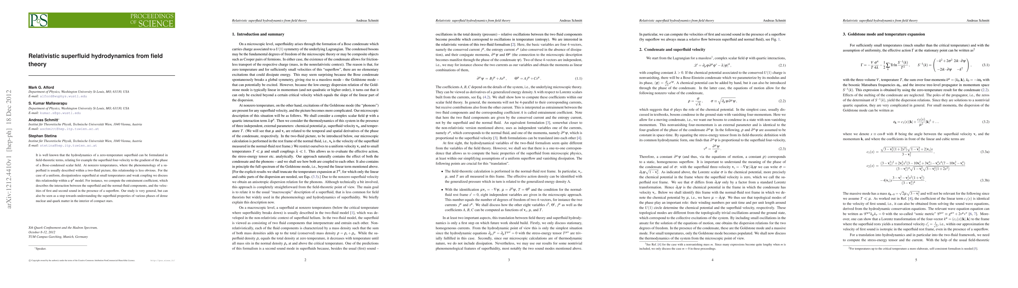 This paper explores relativistic superfluid hydrodynamics at small temperatures and weak coupling using a phi^4 field theory model, computing the entrainment coefficient and sound velocities in a superfluid, and aims to extend understanding to dense nuclear and quark matter in compact stars.