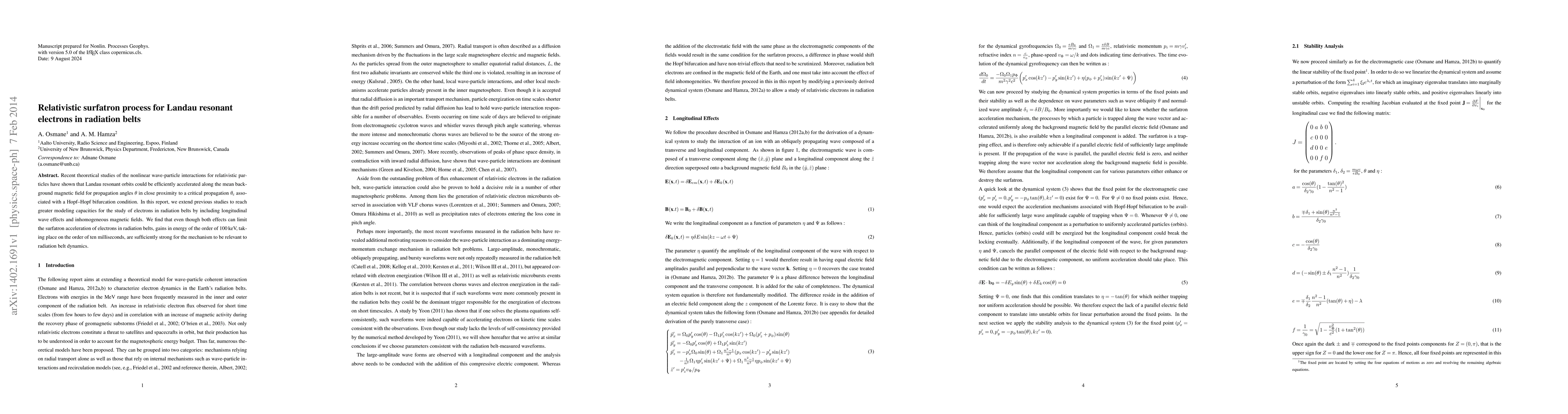 Recent theoretical studies of the nonlinear wave-particle interactions for relativistic particles have shown that Landau resonant orbits could be efficiently accelerated along the mean background magnetic field for propagation angles $\theta$ in close proximity to a critical propagation $\theta_\textrm{c}$ associated with a Hopf--Hopf bifurcation condition. In this report, we extend previous studies to reach greater modeling capacities for the study of electrons in radiation belts by including longitudinal wave effects and inhomogeneous magnetic fields. We find that even though both effects can limit the surfatron acceleration of electrons in radiation belts, gains in energy of the order of 100 keV, taking place on the order of ten milliseconds, are sufficiently strong for the mechanism to be relevant to radiation belt dynamics.