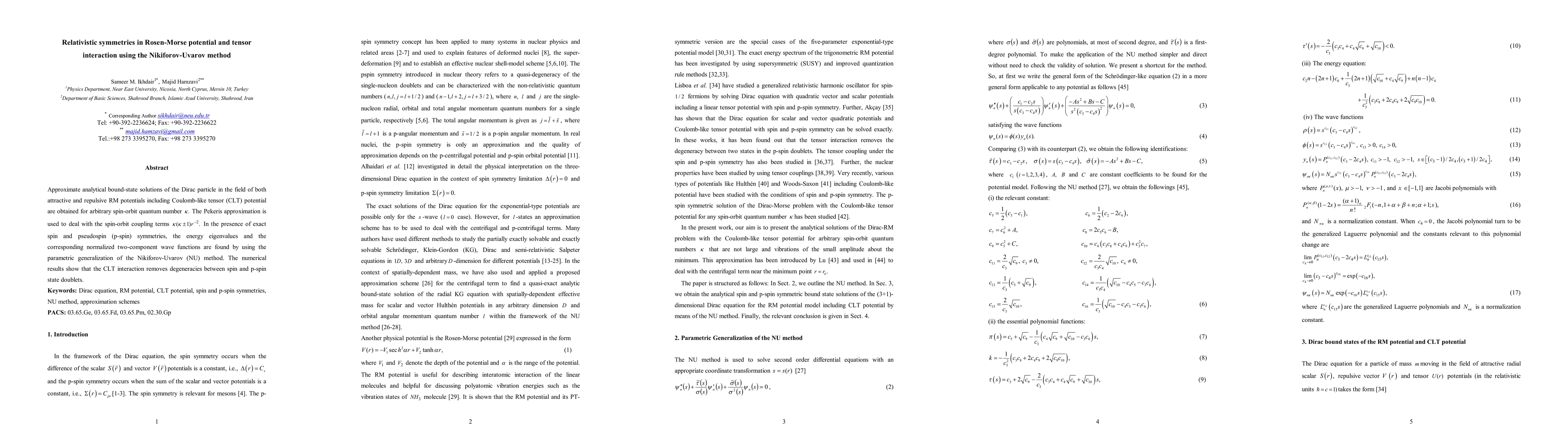 Approximate analytical bound-state solutions of the Dirac particle in the field of both attractive and repulsive RM potentials including Coulomb-like tensor (CLT) potential are obtained for arbitrary spin-orbit quantum number The Pekeris approximation is used to deal with the spin-orbit coupling terms In the presence of exact spin and pseudospin (p-spin) symmetries, the energy eigenvalues and the corresponding normalized two-component wave functions are found by using the parametric generalization of the Nikiforov-Uvarov (NU) method. The numerical results show that the CLT interaction removes degeneracies between spin and p-spin state doublets.