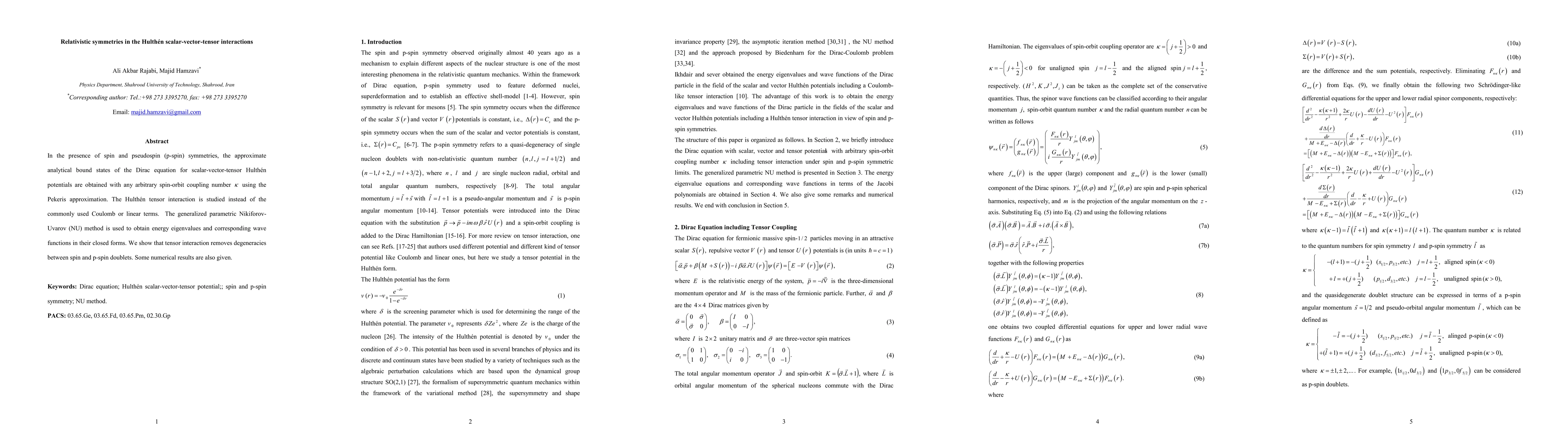 This research investigates relativistic symmetries in Hulthén scalar-vector-tensor interactions using the Pekeris approximation for analytical bound states of the Dirac equation. It employs the generalized parametric Nikiforov-Uvarov method to derive closed-form energy eigenvalues and wave functions, demonstrating that tensor interactions eliminate degeneracies between spin and pseudospin doublets.