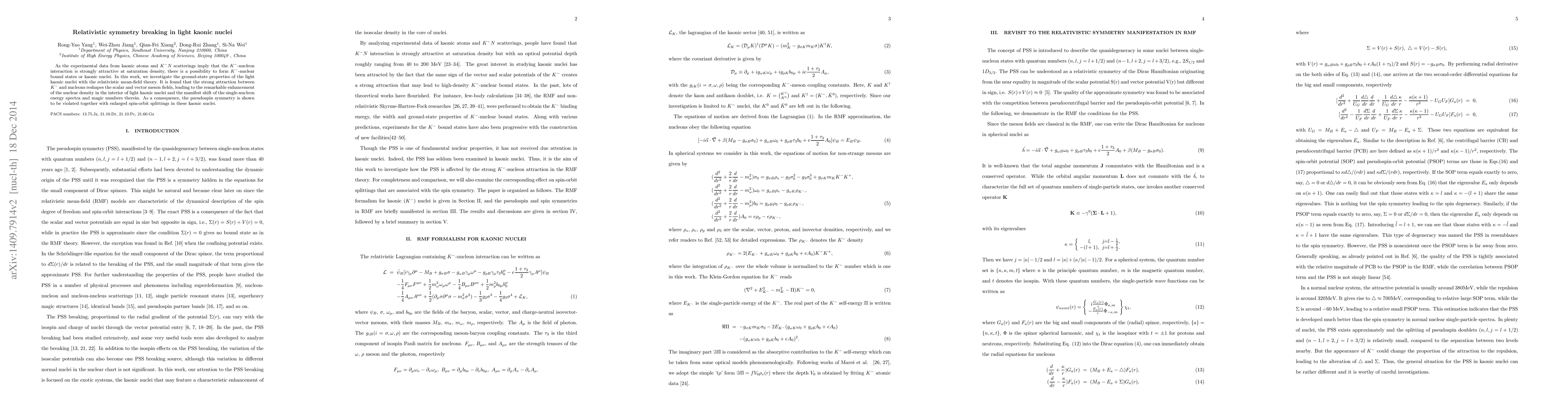 As the experimental data from kaonic atoms and $K^{-}N$ scatterings imply that the $K^{-}$-nucleon interaction is strongly attractive at saturation density, there is a possibility to form $K^{-}$-nuclear bound states or kaonic nuclei. In this work, we investigate the ground-state properties of the light kaonic nuclei with the relativistic mean field theory. It is found that the strong attraction between $K^{-}$ and nucleons reshapes the scalar and vector meson fields, leading to the remarkable enhancement of the nuclear density in the interior of light kaonic nuclei and the manifest shift of the single-nucleon energy spectra and magic numbers therein. As a consequence, the pseudospin symmetry is shown to be violated together with enlarged spin-orbit splittings in these kaonic nuclei.