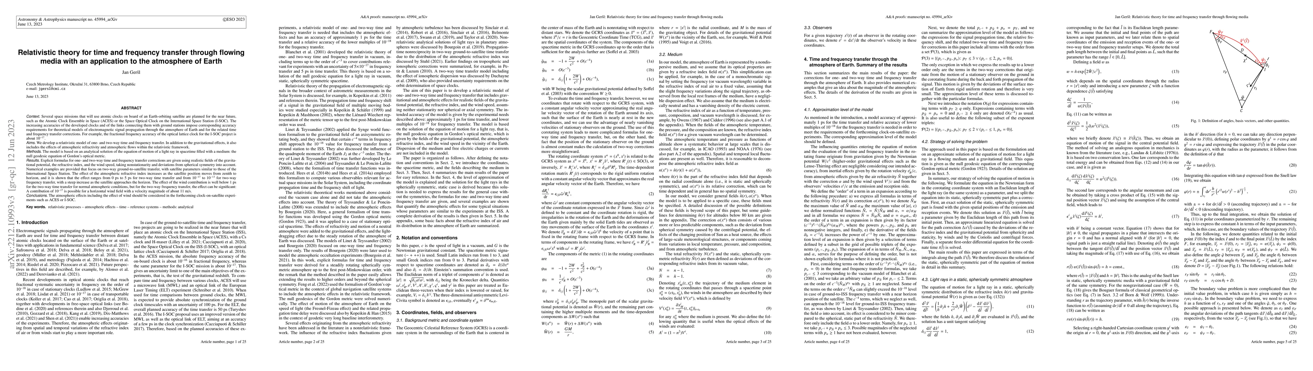 This paper develops a relativistic model for time and frequency transfer through Earth's atmosphere, considering gravitational, refractive, and wind effects. The model provides explicit formulas for corrections in two-way ground-to-satellite transfers, with numerical examples showing atmospheric refractive index effects ranging from 0 ps to 5 ps for time and $10^{-17}$ to $10^{-13}$ for frequency.