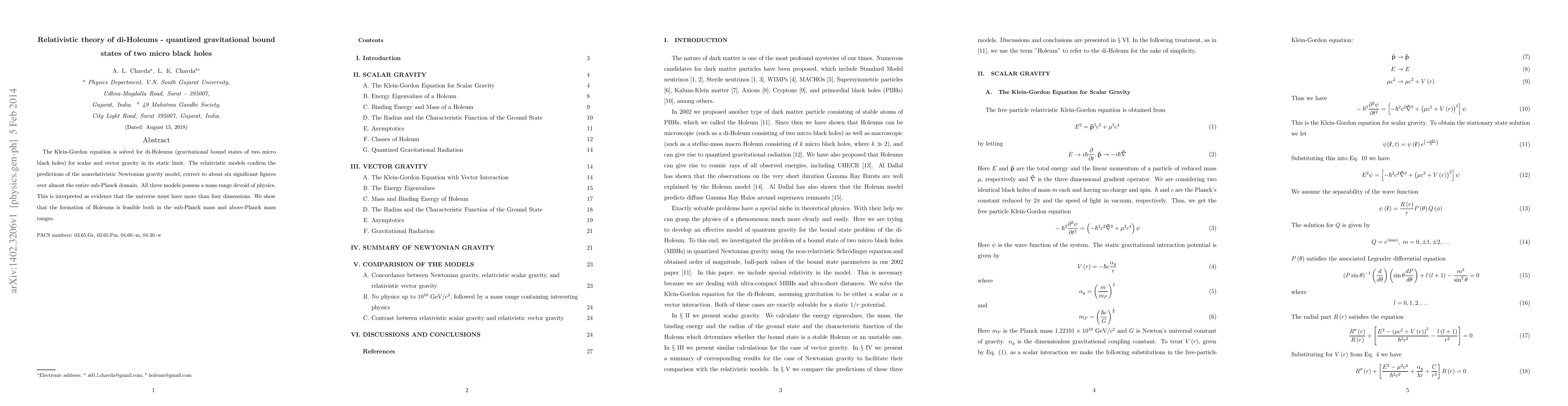The Klein-Gordon equation is solved for di-Holeums (gravitational bound states of two micro black holes) for scalar and vector gravity in its static limit. The relativistic models confirm the predictions of the nonrelativistic Newtonian gravity model, correct to about six significant figures over almost the entire sub-Planck domain. All three models possess a mass range devoid of physics. This is interpreted as evidence that the universe must have more than four dimensions. We show that the formation of Holeums is feasible both in the sub-Planck mass and above-Planck mass ranges.