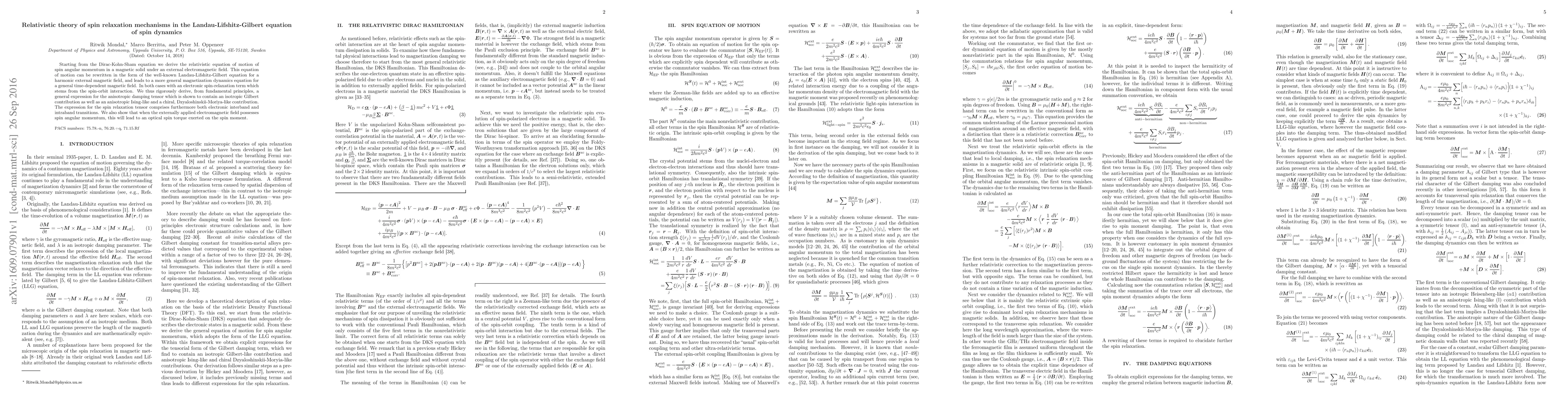 This paper derives a relativistic equation for spin dynamics in magnetic solids, showing the spin relaxation mechanisms within the Landau-Lifshitz-Gilbert equation. It identifies contributions from spin-orbit interaction, including Gilbert damping, Ising-like, and Dzyaloshinskii-Moriya effects, and discusses optical spin torque under external electromagnetic fields.