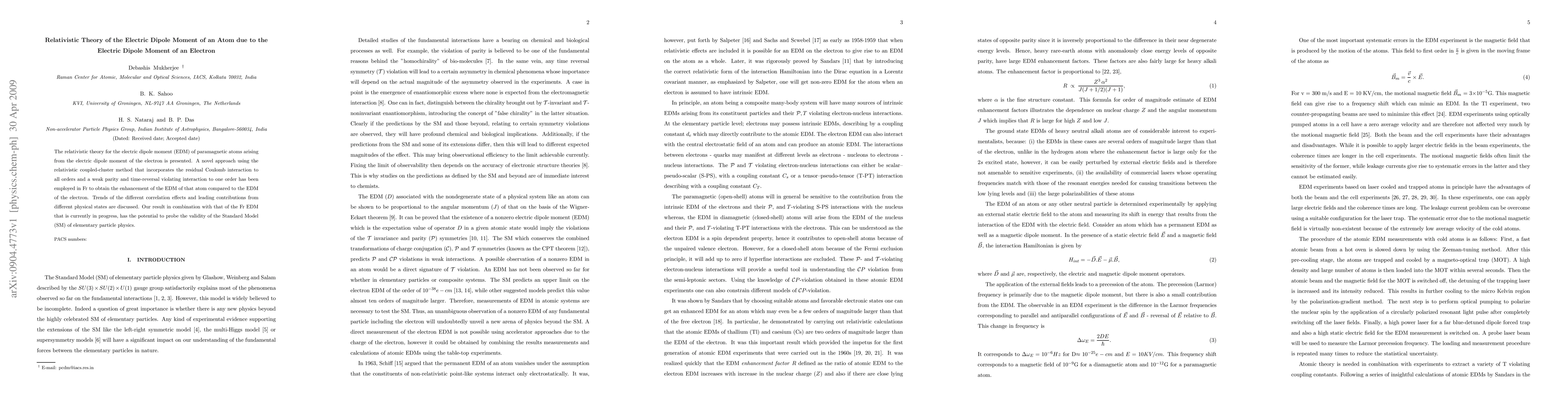 This paper presents a relativistic theory for the electric dipole moment (EDM) of paramagnetic atoms, derived from the electron's EDM using a novel relativistic coupled-cluster method. The results, particularly for Fr, can test the Standard Model's predictions and highlight the influence of various correlation effects.