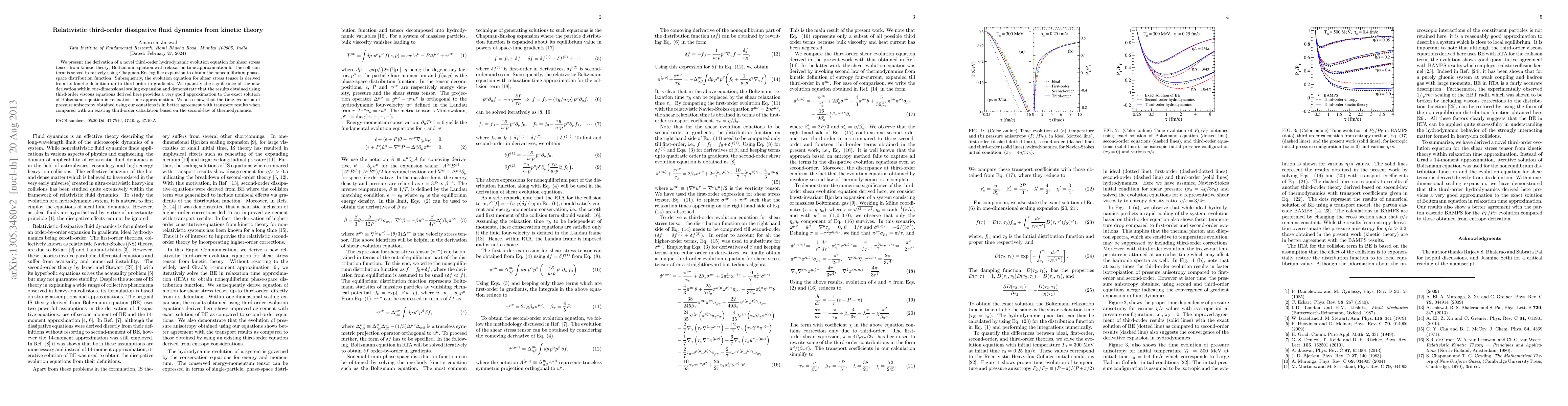 This paper derives a novel third-order hydrodynamic equation for the shear stress tensor from kinetic theory using a Boltzmann equation approach. The results show superior accuracy compared to existing models, particularly in capturing pressure anisotropy and providing an excellent approximation to the exact Boltzmann equation solution.