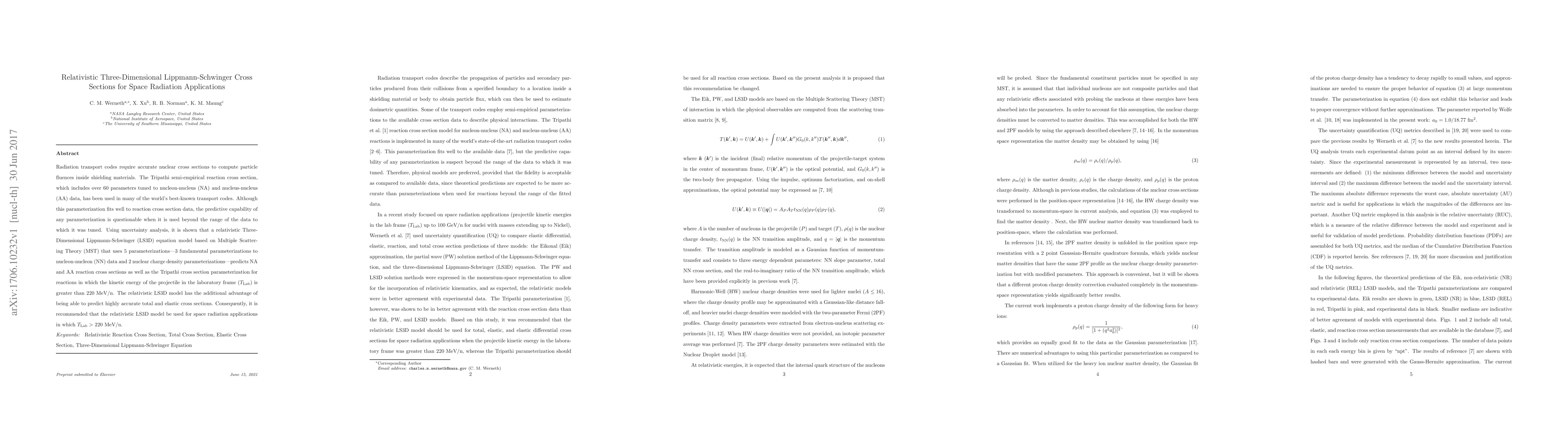 Radiation transport codes require accurate nuclear cross sections to compute particle fluences inside shielding materials. The Tripathi semi-empirical reaction cross section, which includes over 60 parameters tuned to nucleon-nucleus (NA) and nucleus-nucleus (AA) data, has been used in many of the world's best-known transport codes. Although this parameterization fits well to reaction cross section data, the predictive capability of any parameterization is questionable when it is used beyond the range of the data to which it was tuned. Using uncertainty analysis, it is shown that a relativistic Three-Dimensional Lippmann-Schwinger (LS3D) equation model based on Multiple Scattering Theory (MST) that uses 5 parameterizations---3 fundamental parameterizations to nucleon-nucleon (NN) data and 2 nuclear charge density parameterizations---predicts NA and AA reaction cross sections as well as the Tripathi cross section parameterization for reactions in which the kinetic energy of the projectile in the laboratory frame ($T_{\rm Lab}$) is greater than 220 MeV/n. The relativistic LS3D model has the additional advantage of being able to predict highly accurate total and elastic cross sections. Consequently, it is recommended that the relativistic LS3D model be used for space radiation applications in which $T_{\rm Lab}>$ 220 MeV/n.