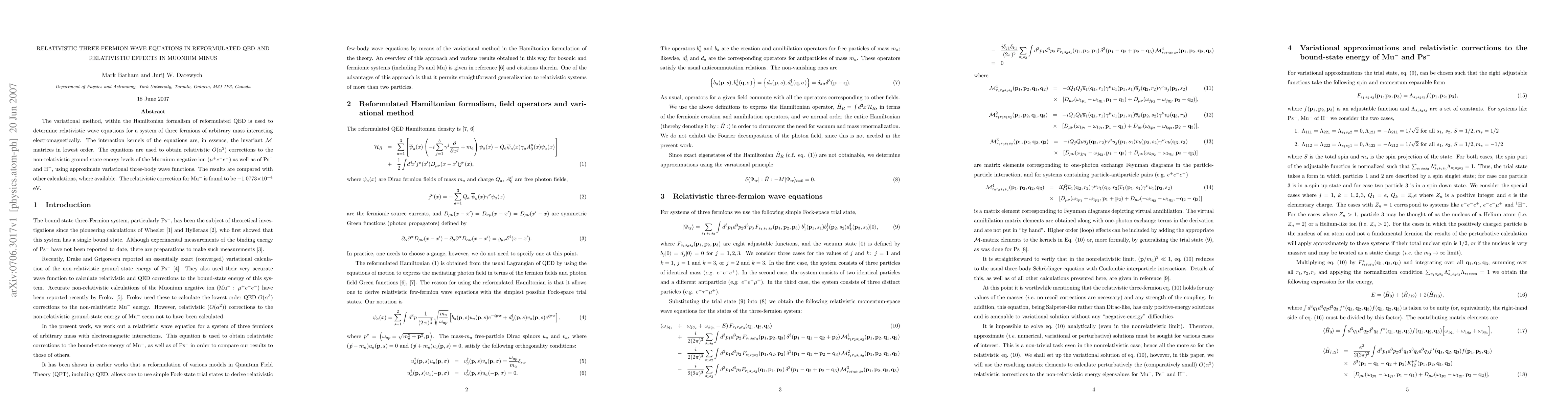 This paper employs the variational method in reformulated QED to derive relativistic wave equations for three interacting fermions, applying these to calculate $O(\alpha^2)$ corrections for the ground state energy levels of Muonium minus, Ps minus, and H minus. The relativistic correction for Mu$^-$ is determined to be $-1.0773 \times 10^{-4}$ eV.