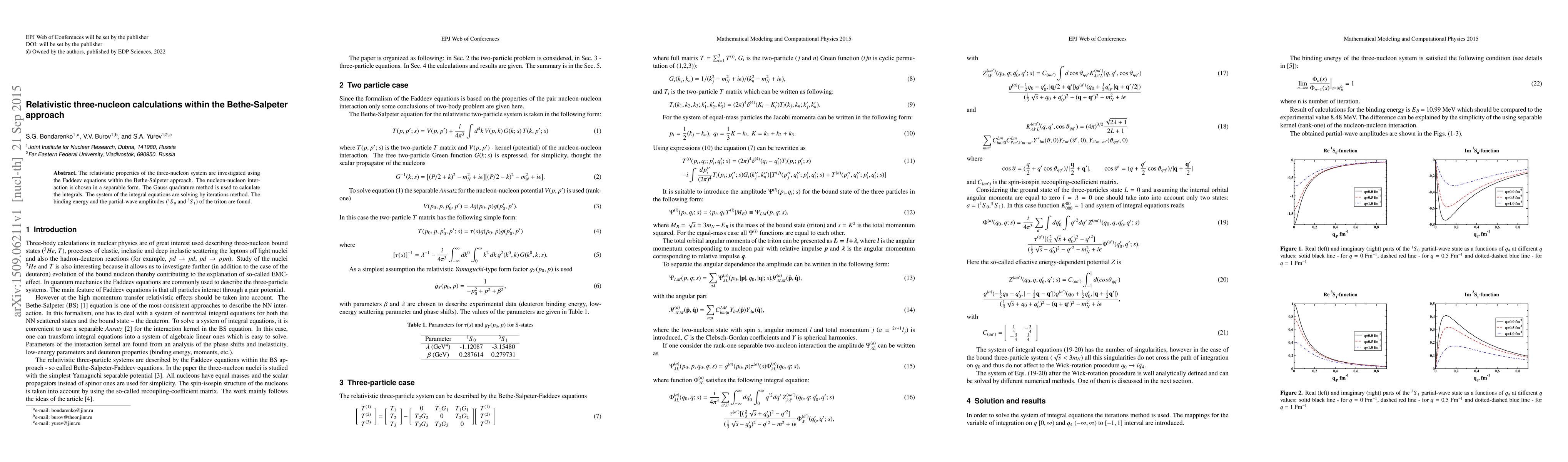 This paper investigates the relativistic properties of the three-nucleon system using the Bethe-Salpeter approach and Faddeev equations, solving the integral equations iteratively to find the binding energy and partial-wave amplitudes of the triton. The nucleon-nucleon interaction is modeled in a separable form, with calculations facilitated by the Gauss quadrature method.