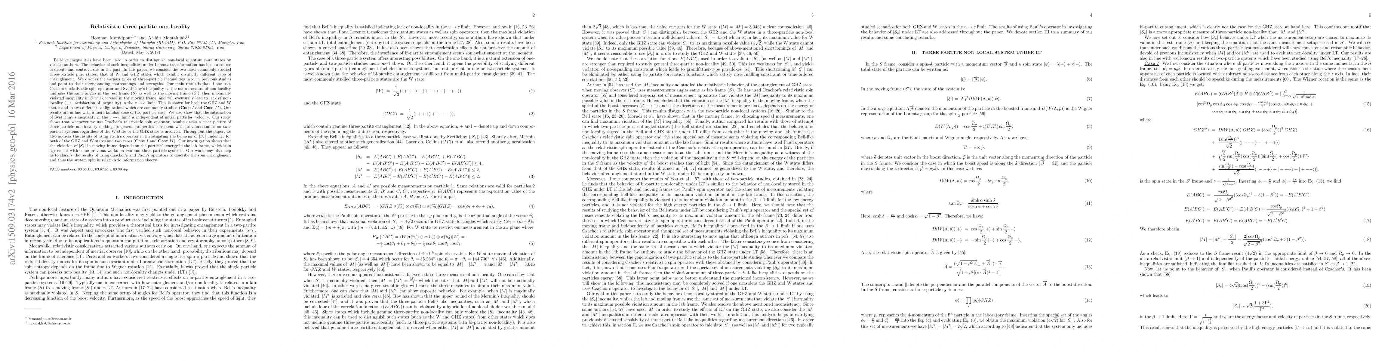 Bell-like inequalities have been used in order to distinguish non-local quantum pure states by various authors. The behavior of such inequalities under Lorentz transformation has been a source of debate and controversies in the past. In this paper, we consider the two most commonly studied three-particle pure states, that of W and GHZ states which exhibit distinctly different type of entanglement. We discuss the various types of three-particle inequalities used in previous studies and point to their corresponding shortcomings and strengths. Our main result is that if one uses Czachor's relativistic spin operator and Svetlichny's inequality as the main measure of non-locality and uses the same angles in the rest frame ($S$) as well as the moving frame ($S^{\prime}$), then maximally violated inequality in $S$ will decrease in the moving frame, and will eventually lead to lack of non-locality ( i.e. satisfaction of inequality) in the $v \rightarrow c$ limit. This is shown for both the GHZ and W states and in two different configurations which are commonly studied (\textbf{Case $I$} and \textbf{Case $II$}). Our results are in line with a more familiar case of two particle case. We also show that the satisfaction of Svetlichny's inequality in the $v\rightarrow c$ limit is independent of initial particles' velocity. Our study shows that whenever we use Czachor's relativistic spin operator, results draws a clear picture of three-particle non-locality making its general properties consistent with previous studies on two-particle systems regardless of the W state or the GHZ state is involved.....