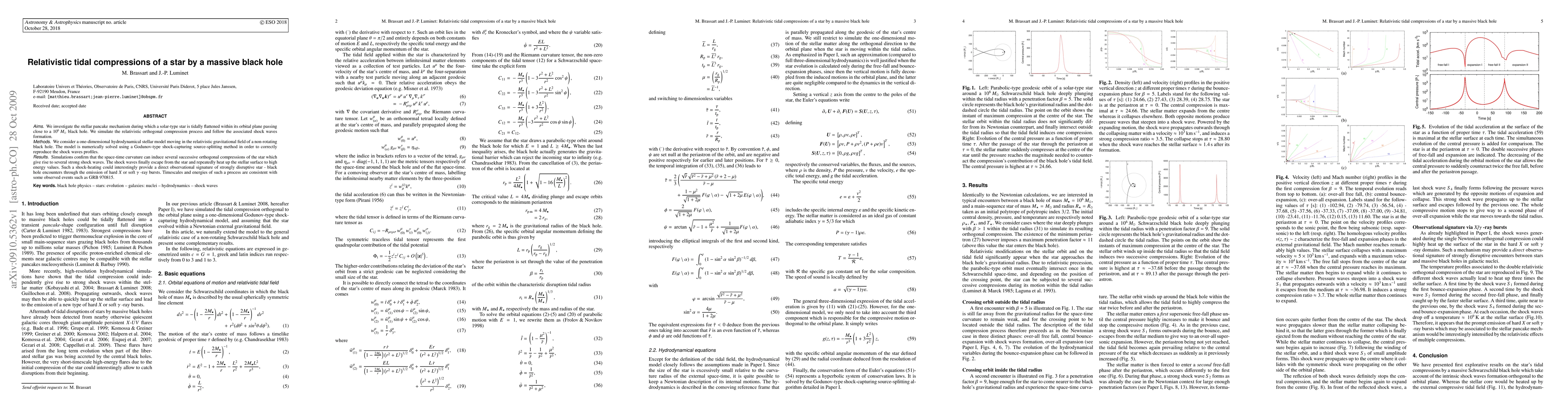 Aims: We investigate the stellar pancake mechanism during which a solar-type star is tidally flattened within its orbital plane passing close to a 10^6 solar masses black hole. We simulate the relativistic orthogonal compression process and follow the associated shock waves formation. Methods: We consider a one-dimensional hydrodynamical stellar model moving in the relativistic gravitational field of a non-rotating black hole. The model is numerically solved using a Godunov-type shock-capturing source-splitting method in order to correctly reproduce the shock waves profiles. Results: Simulations confirm that the space-time curvature can induce several successive orthogonal compressions of the star which give rise to several strong shock waves. The shock waves finally escape from the star and repeatedly heat up the stellar surface to high energy values. Such a shock-heating could interestingly provide a direct observational signature of strongly disruptive star - black hole encounters through the emission of hard X or soft gamma-ray bursts. Timescales and energies of such a process are consistent with some observed events such as GRB 970815.