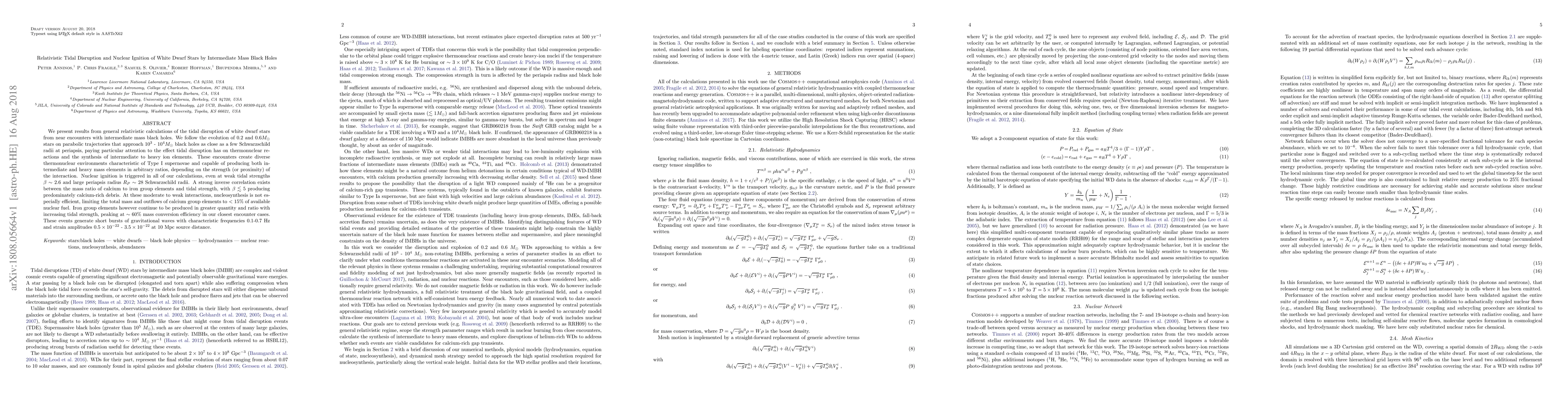 We present results from general relativistic calculations of the tidal disruption of white dwarf stars from near encounters with intermediate mass black holes. We follow the evolution of 0.2 and $0.6 M_\odot$ stars on parabolic trajectories that approach $10^3$ - $10^4 M_\odot$ black holes as close as a few Schwarzschild radii at periapsis, paying particular attention to the effect tidal disruption has on thermonuclear reactions and the synthesis of intermediate to heavy ion elements. These encounters create diverse thermonuclear environments characteristic of Type I supernovae and capable of producing both intermediate and heavy mass elements in arbitrary ratios, depending on the strength (or proximity) of the interaction. Nuclear ignition is triggered in all of our calculations, even at weak tidal strengths $\beta \sim 2.6$ and large periapsis radius $R_P \sim 28$ Schwarzschild radii. A strong inverse correlation exists between the mass ratio of calcium to iron group elements and tidal strength, with $\beta \lesssim 5$ producing predominately calcium-rich debris. At these moderate to weak interactions, nucleosynthesis is not especially efficient, limiting the total mass and outflows of calcium group elements to $< 15$\% of available nuclear fuel. Iron group elements however continue to be produced in greater quantity and ratio with increasing tidal strength, peaking at $\sim 60$\% mass conversion efficiency in our closest encounter cases. These events generate short bursts of gravitational waves with characteristic frequencies 0.1-0.7 Hz and strain amplitudes $0.5\times10^{-22}$ - $3.5\times10^{-22}$ at 10 Mpc source distance.