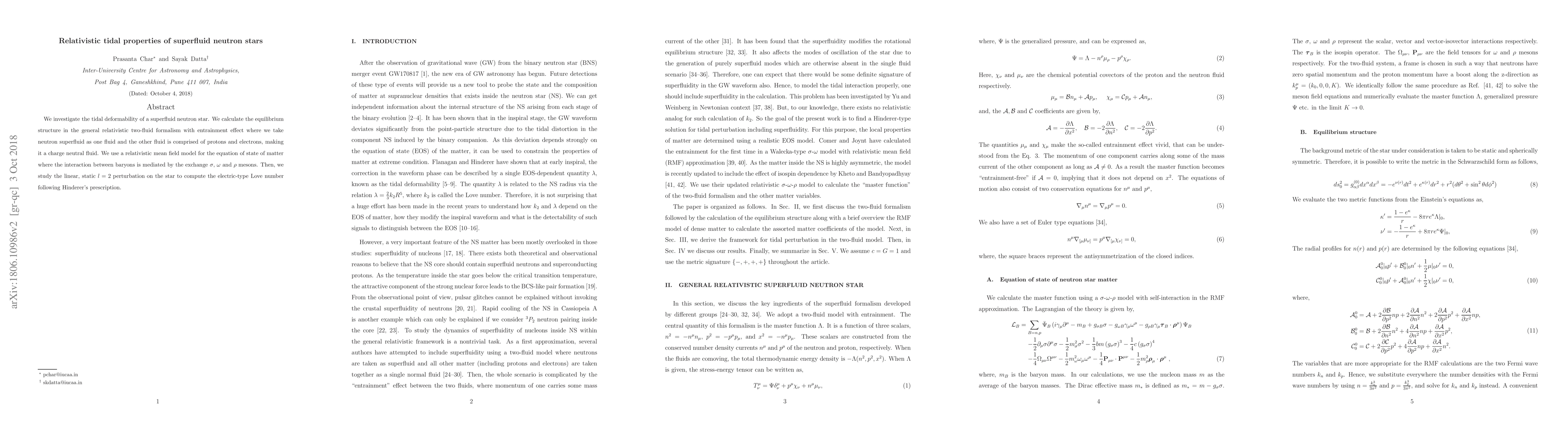 We investigate the tidal deformability of a superfluid neutron star. We calculate the equilibrium structure in the general relativistic two-fluid formalism with entrainment effect where we take neutron superfluid as one fluid and the other fluid is comprised of protons and electrons, making it a charge neutral fluid. We use a relativistic mean field model for the equation of state of matter where the interaction between baryons is mediated by the exchange $\sigma$, $\omega$ and $\rho$ mesons. Then, we study the linear, static $l=2$ perturbation on the star to compute the electric-type Love number following Hinderer's prescription.