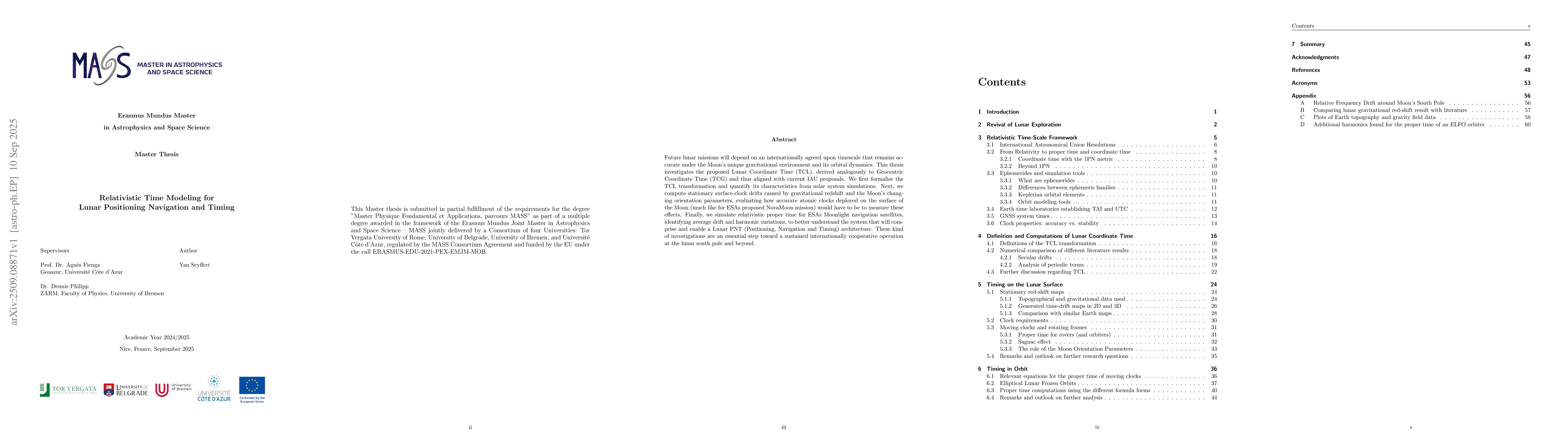 Future lunar missions will depend on an internationally agreed upon timescale that remains accurate under the Moon's unique gravitational environment and its orbital dynamics. This thesis investigates the proposed Lunar Coordinate Time (TCL), derived analogously to Geocentric Coordinate Time (TCG) and thus aligned with current IAU proposals. We first formalise the TCL transformation and quantify its characteristics from solar system simulations. Next, we compute stationary surface-clock drifts caused by gravitational redshift and the Moon's changing orientation parameters, evaluating how accurate atomic clocks deployed on the surface of the Moon (much like for ESA's proposed NovaMoon mission) would have to be to measure these effects. Finally, we simulate relativistic proper time for ESA's Moonlight navigation satellites, identifying average drift and harmonic variations, to better understand the system that will comprise and enable a Lunar PNT (Positioning, Navigation and Timing) architecture. These kinds of investigations are an essential step toward a sustained internationally cooperative operation at the lunar south pole and beyond.