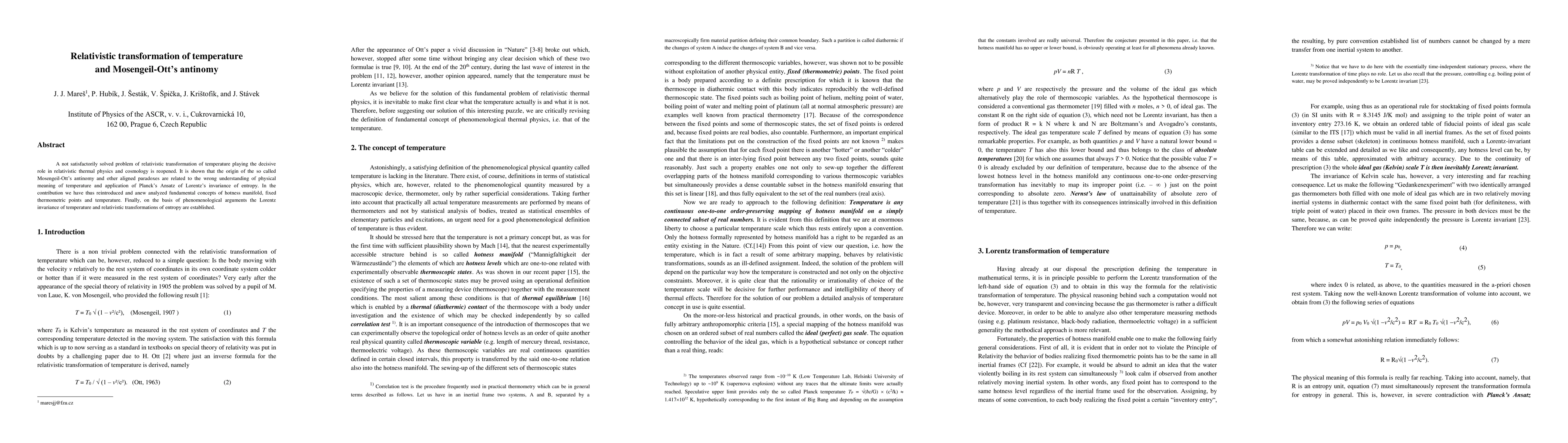 A not satisfactorily solved problem of relativistic transformation of temperature playing the decisive role in relativistic thermal physics and cosmology is reopened. It is shown that the origin of the so called Mosengeil-Ott's antinomy and other aligned paradoxes are related to the wrong understanding of physical meaning of temperature and application of Planck's Ansatz of Lorentz's invariance of entropy. In the contribution we have thus reintroduced and anew analyzed fundamental concepts of hotness manifold, fixed thermometric points and temperature. Finally, on the basis of phenomenological arguments the Lorentz invariance of temperature and relativistic transformations of entropy are established.