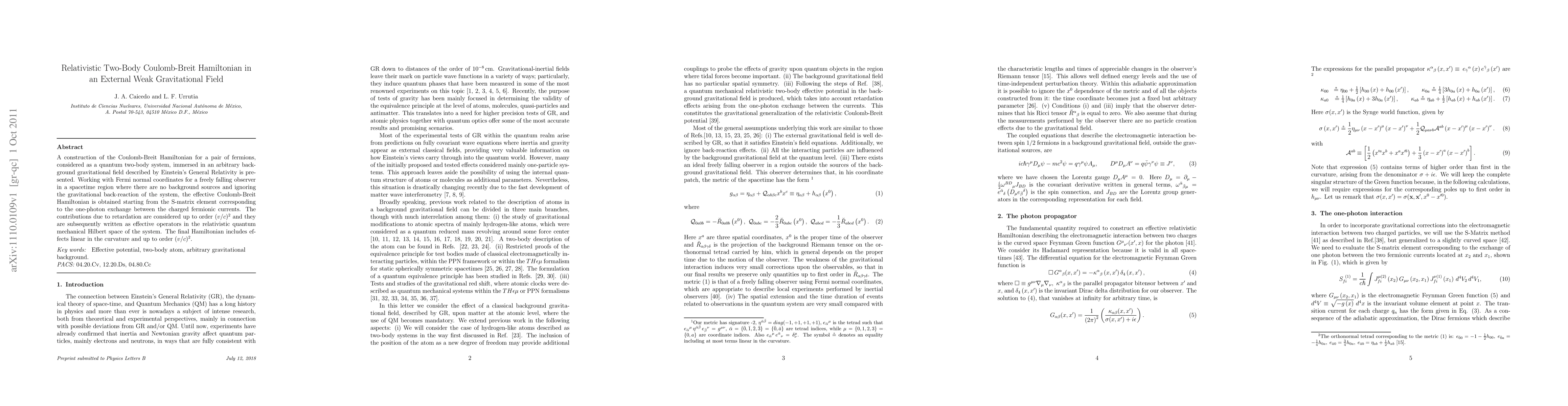 A construction of the Coulomb-Breit Hamiltonian for a pair of fermions, considered as a quantum two-body system, immersed in an arbitrary background gravitational field described by Einstein's General Relativity is presented. Working with Fermi normal coordinates for a freely falling observer in a spacetime region where there are no background sources and ignoring the gravitational back-reaction of the system, the effective Coulomb-Breit Hamiltonian is obtained starting from the S-matrix element corresponding to the one-photon exchange between the charged fermionic currents. The contributions due to retardation are considered up to order (v/c)^2 and they are subsequently written as effective operators in the relativistic quantum mechanical Hilbert space of the system. The final Hamiltonian includes effects linear in the curvature and up to order (v/c)^2.