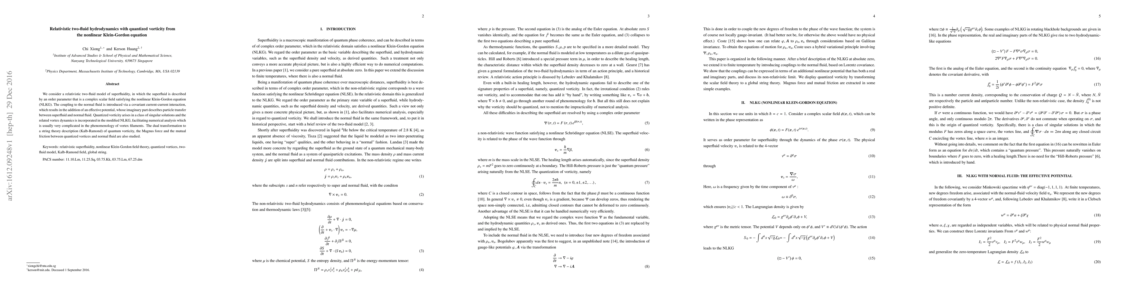 This paper develops a relativistic two-fluid hydrodynamic model for superfluidity using a complex scalar field governed by the nonlinear Klein-Gordon equation, incorporating quantized vorticity and vortex dynamics. It also explores dual string theory aspects, including the Magnus force and mutual friction between vortices and normal fluid.