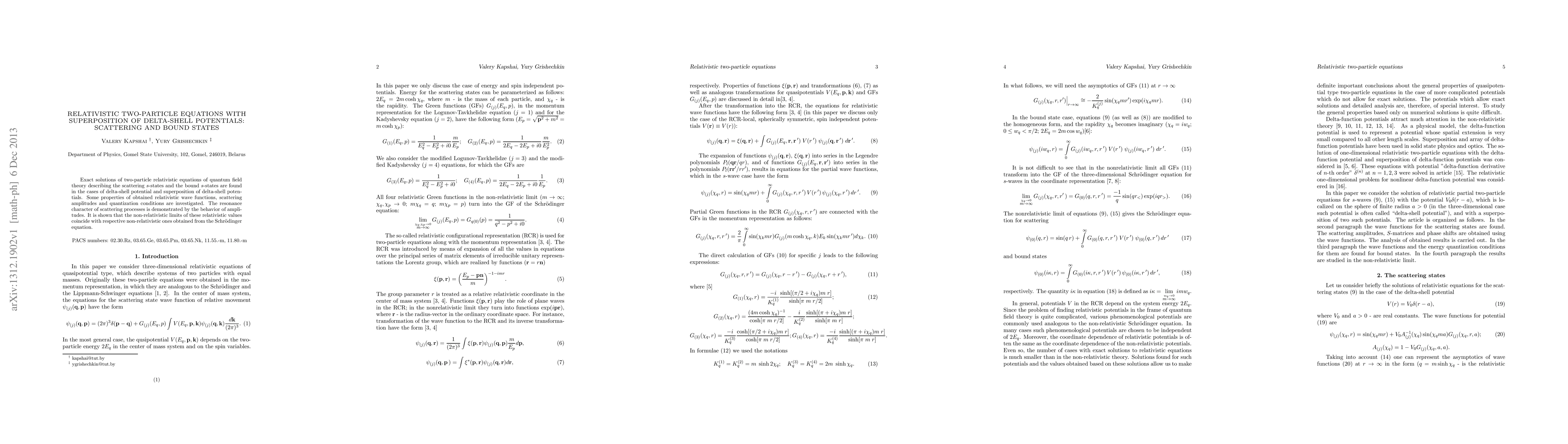 This paper presents exact solutions for relativistic two-particle scattering and bound states using delta-shell potentials and their superpositions in quantum field theory. It investigates the properties of relativistic wave functions, scattering amplitudes, and quantization conditions, demonstrating the resonance nature of scattering processes and the consistency of non-relativistic limits with Schrödinger equation results.