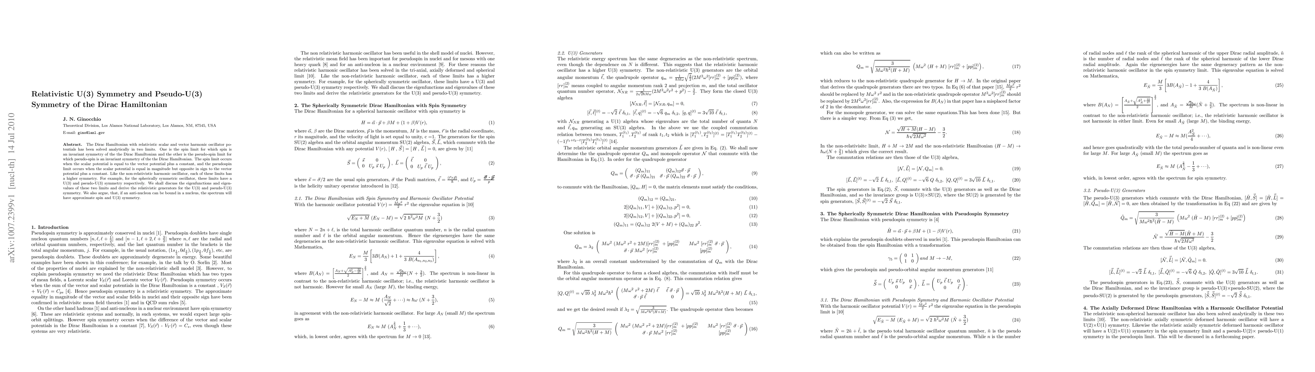 The Dirac Hamiltonian with relativistic scalar and vector harmonic oscillator potentials has been solved analytically in two limits. One is the spin limit for which spin is an invariant symmetry of the the Dirac Hamiltonian and the other is the pseudo-spin limit for which pseudo-spin is an invariant symmetry of the the Dirac Hamiltonian. The spin limit occurs when the scalar potential is equal to the vector potential plus a constant, and the pseudospin limit occurs when the scalar potential is equal in magnitude but opposite in sign to the vector potential plus a constant. Like the non-relativistic harmonic oscillator, each of these limits has a higher symmetry. For example, for the spherically symmetric oscillator, these limits have a U(3) and pseudo-U(3) symmetry respectively. We shall discuss the eigenfunctions and eigenvalues of these two limits and derive the relativistic generators for the U(3) and pseudo-U(3) symmetry. We also argue, that, if an anti-nucleon can be bound in a nucleus, the spectrum will have approximate spin and U(3) symmetry.