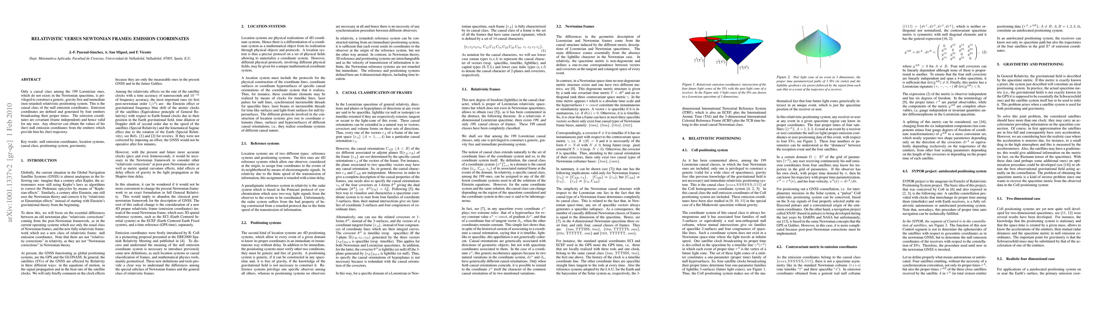 This paper discusses the unique causal class of null emission coordinates in relativistic frames, which allows for immediate, gravity-free positioning, unlike Newtonian spacetime. These coordinates, defined by four emitters broadcasting their proper times, are covariant and universally applicable.