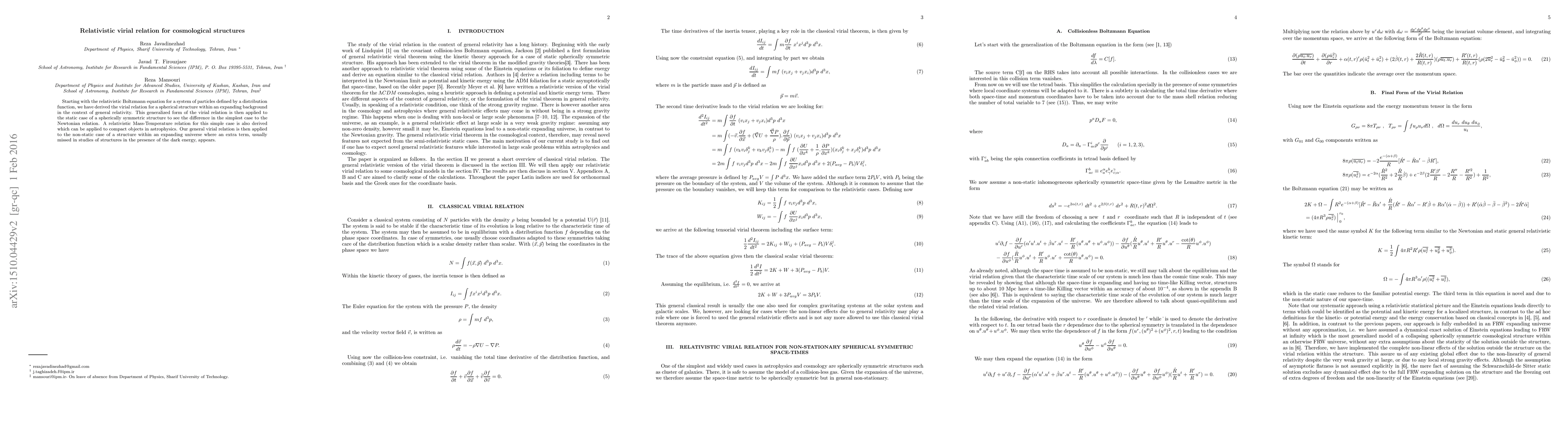 Starting with the relativistic Boltzmann equation for a system of particles defined by a distribution function, we have derived the virial relation for a spherical structure within an expanding background in the context of general relativity. This generalized form of the virial relation is then applied to the static case of a spherically symmetric structure to see the difference in the simplest case to the Newtonian relation. A relativistic Mass-Temperature relation for this simple case is also derived which can be applied to compact objects in astrophysics. Our general virial relation is then applied to the non-static case of a structure within an expanding universe where an extra term, usually missed in studies of structures in the presence of the dark energy, appears.