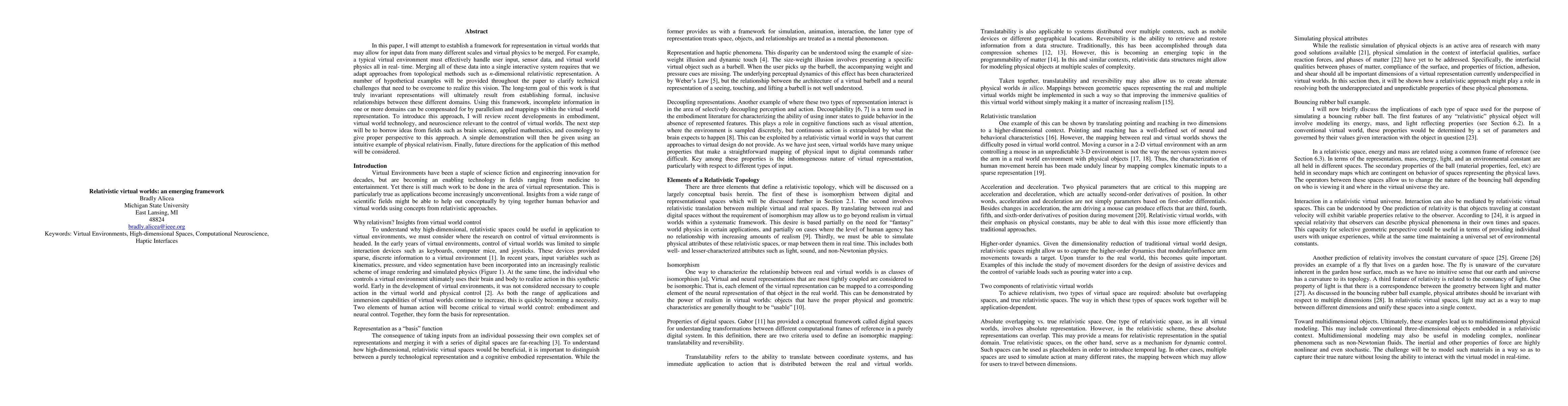 This paper proposes a framework for representing virtual worlds in relativistic terms, allowing for the integration of user input, sensor data, and physics in real-time. The goal is to develop truly invariant representations that can compensate for incomplete information across different domains.