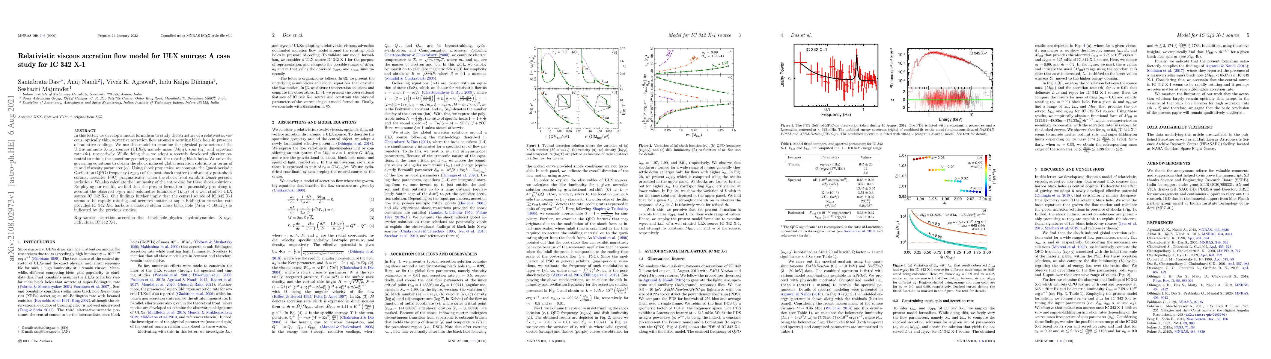 In this letter, we develop a model formalism to study the structure of a relativistic, viscous, optically thin, advective accretion flow around a rotating black hole in presence of radiative coolings. We use this model to examine the physical parameters of the Ultra-luminous X-ray sources (ULXs), namely mass ($M_{\rm BH}$), spin ($a_{\rm k}$) and accretion rate (${\dot m}$), respectively. While doing this, we adopt a recently developed effective potential to mimic the spacetime geometry around the rotating black holes. We solve the governing equations to obtain the shock induced global accretion solutions in terms of ${\dot m}$ and viscosity parameter ($\alpha$). Using shock properties, we compute the Quasi-periodic Oscillation (QPO) frequency ($\nu_{\rm QPO}$) of the post-shock matter (equivalently post-shock corona, hereafter PSC) pragmatically, when the shock front exhibits Quasi-periodic variations. We also calculate the luminosity of the entire disc for these shock solutions. Employing our results, we find that the present formalism is potentially promising to account the observed $\nu_{\rm QPO}$ and bolometric luminosity ($L_{\rm bol}$) of a well studied ULX source IC 342 X-1. Our findings further imply that the central source of IC 342 X-1 seems to be rapidly rotating and accretes matter at super-Eddington accretion rate provided IC 342 X-1 harbors a massive stellar mass black hole ($M_{\rm BH} < 100 M_\odot$) as indicated by the previous studies.