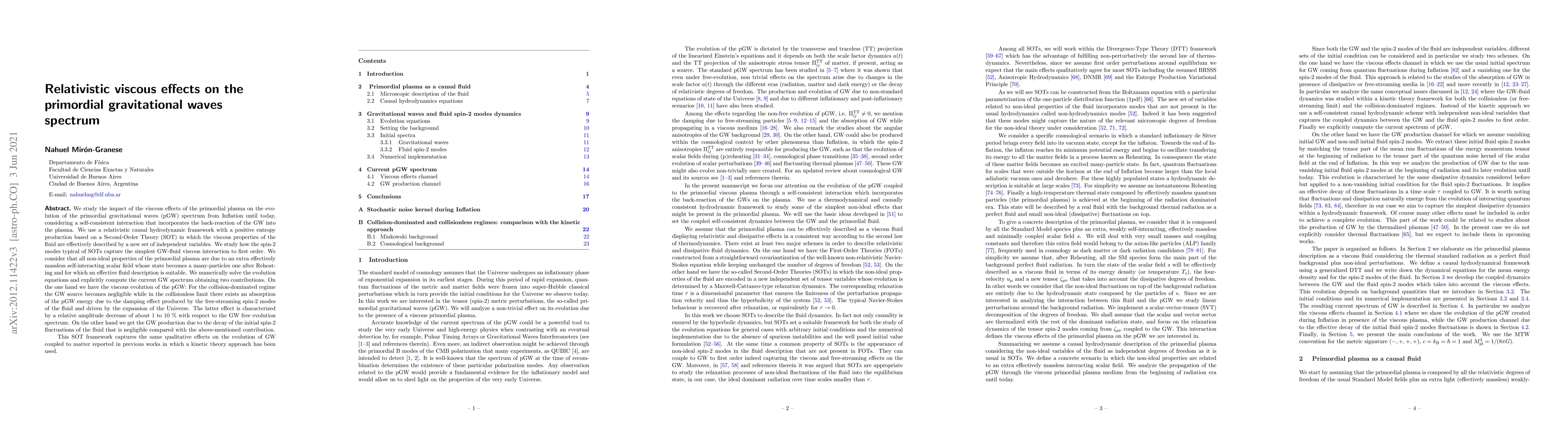This paper investigates the relativistic viscous effects of primordial plasma on the primordial gravitational waves (pGW) spectrum, employing a Second-Order Theory (SOT) framework. It finds that viscous interactions lead to a relative amplitude decrease of 1 to 10% in the pGW spectrum, primarily due to the damping effect of free-streaming spin-2 modes in the collisionless regime.