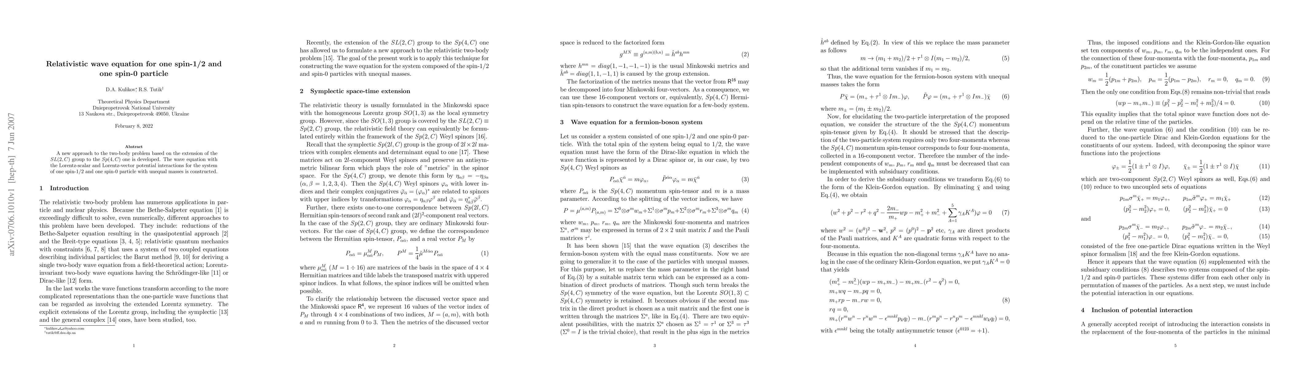 Researchers develop a new wave equation for a system of one spin-1/2 particle and one spin-0 particle with unequal masses, using the $Sp(4,C)$ group to extend the $SL(2,C)$ framework.