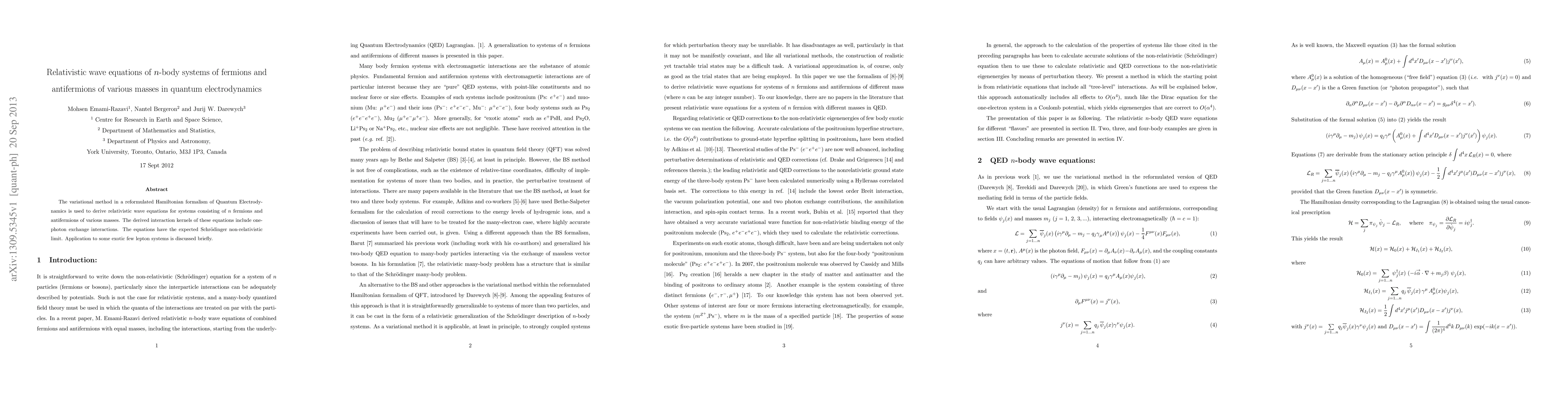 The variational method in a reformulated Hamiltonian formalism of Quantum Electrodynamics is used to derive relativistic wave equations for systems consisting of n fermions and antifermions of various masses. The derived interaction kernels of these equations include one-photon exchange interactions. The equations have the expected Schroedinger non-relativistic limit. Application to some exotic few lepton systems is discussed briefly.