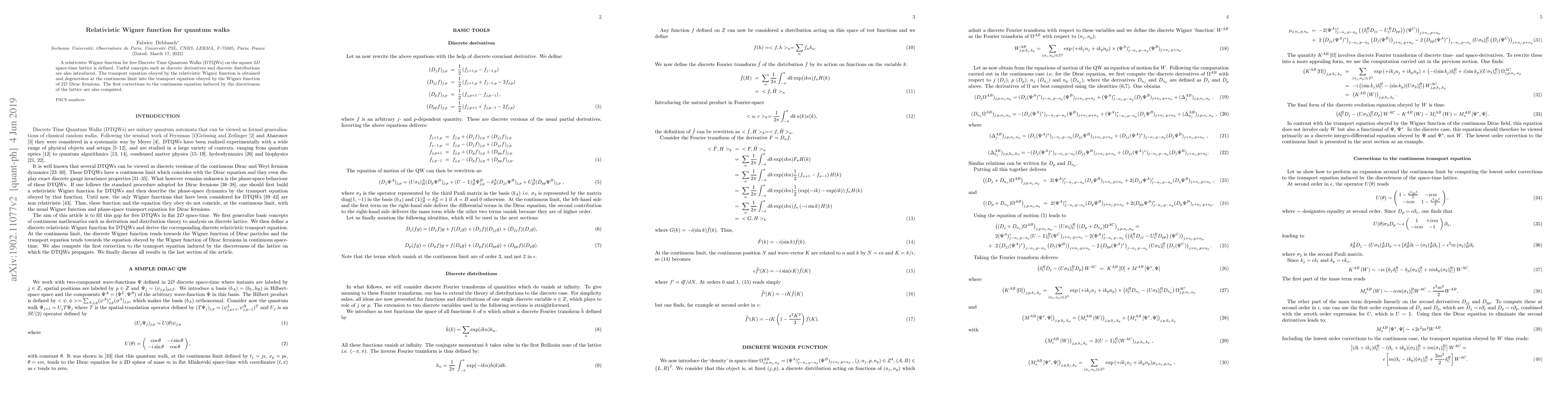A relativistic Wigner function for free Discrete Time Quantum Walks (DTQWs) on the square $2D$ space-time lattice is defined. Useful concepts such as discrete derivatives and discrete distributions are also introduced. The transport equation obeyed by the relativistic Wigner function is obtained and degenerates at the continuous limit into the transport equation obeyed by the Wigner function of $2D$ Dirac fermions. The first corrections to the continuous equation induced by the discreteness of the lattice are also computed.
